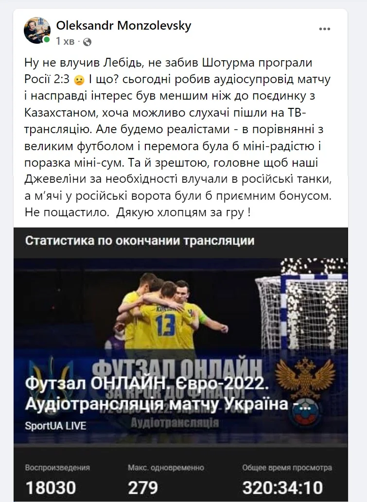 Спортивний коментатор Олександр Монзолевський відзначає, що на аудіосупровід матчу з росіянами був менший попит, ніж на гру з Казахстаном. Можливо, сьогодні більше українців хотіли це ще й бачити.