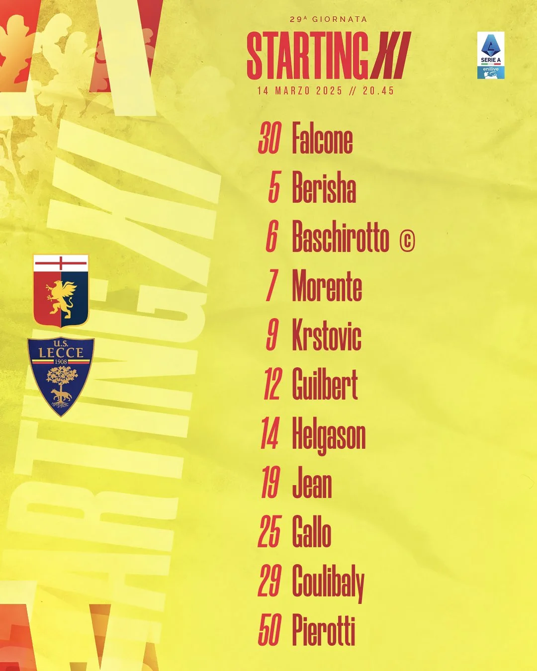 Стартовий склад Лечче: Фальконе – Гільбер, Баскіротто, Жан, Галло – Кулібалі, Беріша – П'єротті, Хельгассон, Тете Моренте – Крстовіч.
