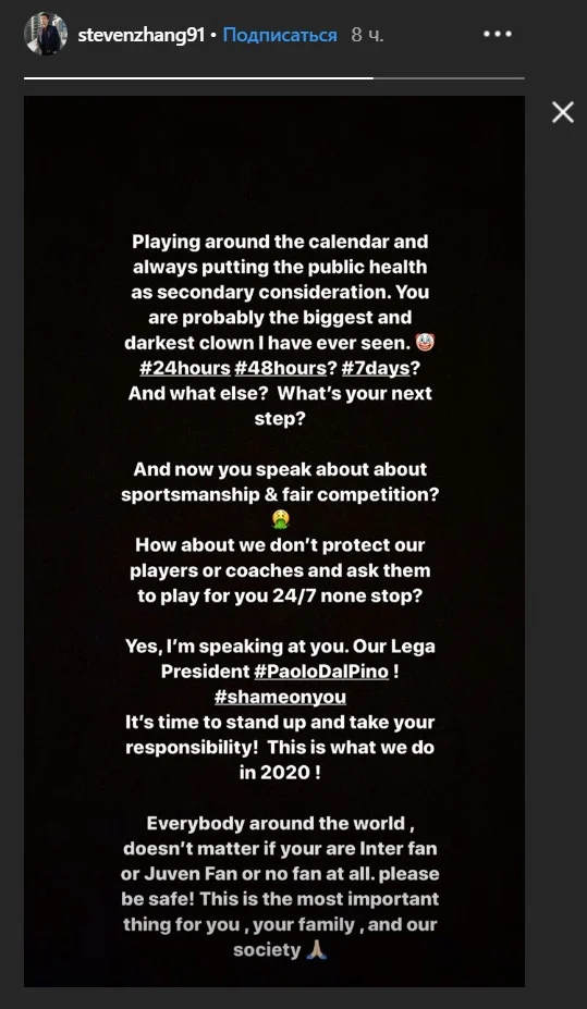 Ганьба вам, Паоло Даль Піно. Настав час взяти на себе відповідальність. Так всі і чинять в 2020. Неважливо, де ви живете і вболіваєте за Інтер або Ювентус. Немає нічого важливішого за безпеку і здоров'я. Це пріоритет для вас, вашої родини і суспільства", – написав Чжан у інстаграмі.