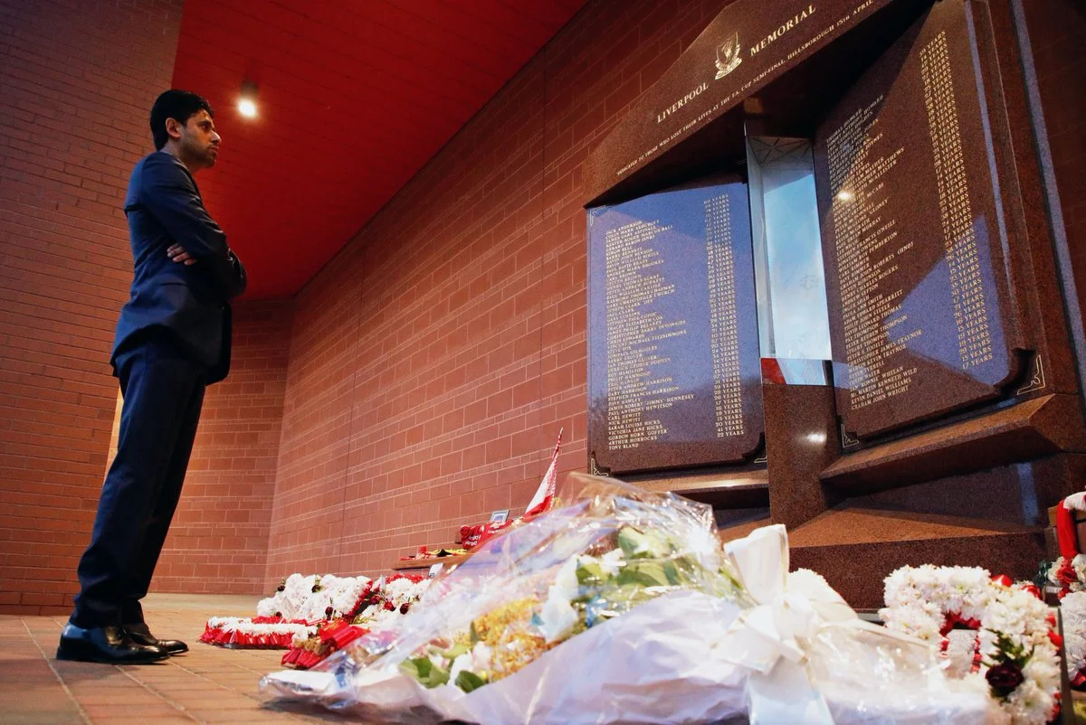 Нассер Аль-Хелаїфі поклав квіти біля меморіальної дошки з іменами всіх жертв трагедії Хіллсборо, що сталась у 1989 році.