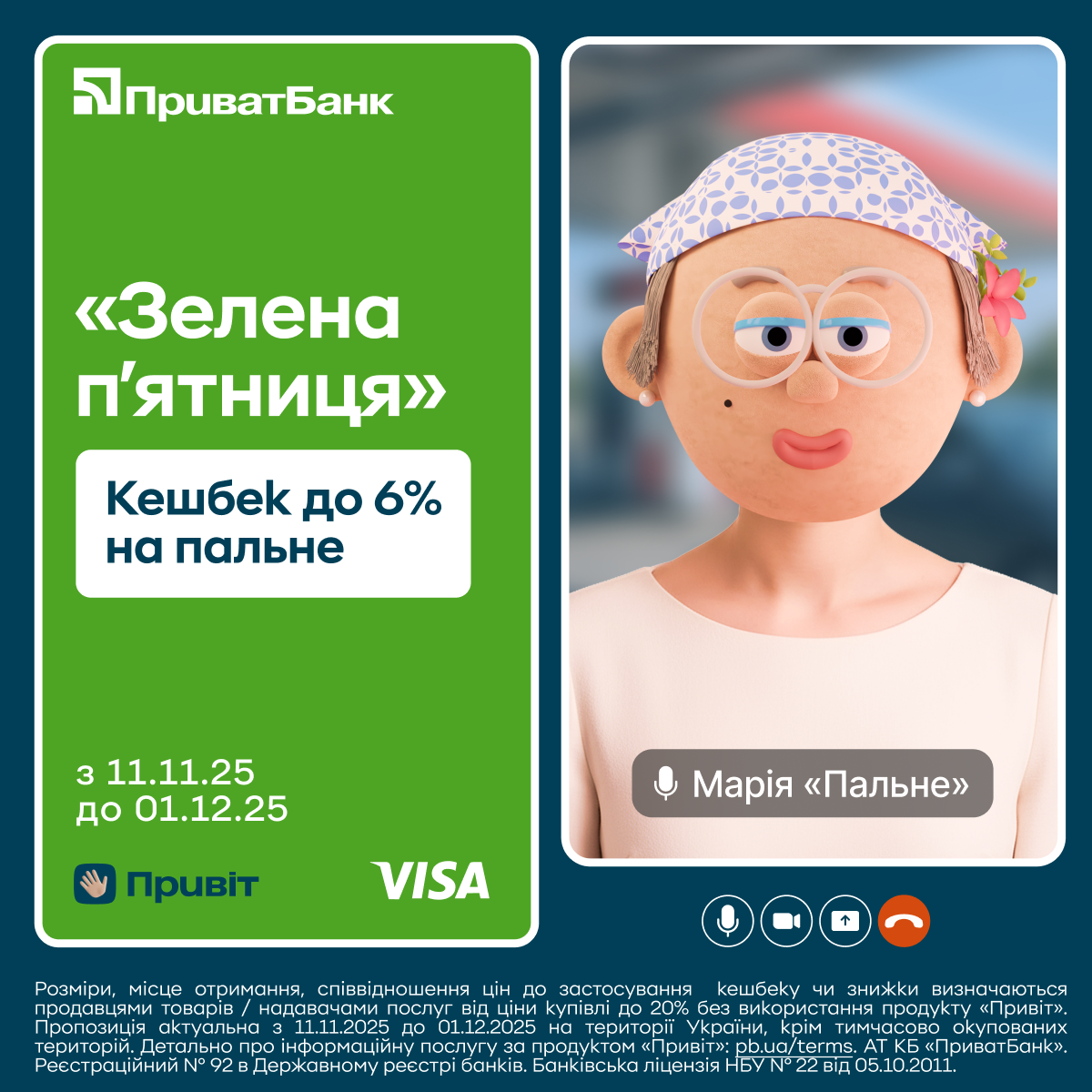 У межах "Зеленої п'ятниці" діятимуть кешбеки до 20% при оплаті картками Visa від ПриватБанку в кафе, ресторанах, магазинах одягу та АЗС, а також при купівлі дитячих товарів, побутової техніки, будівельних матеріалів та категорії beauty.