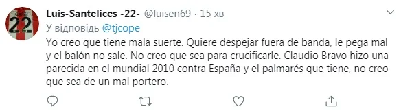 "Я вважаю, що йому просто не пощастило. Він намагався винести м'яча за бокову лінію, але пробив неакцентовано. Не думаю, що його потрібно розпинати. Клаудіо Браво припустився схожої помилки на ЧС-2010 проти Іспанії, але не став гіршим воротарем, вигравши чимало титулів".