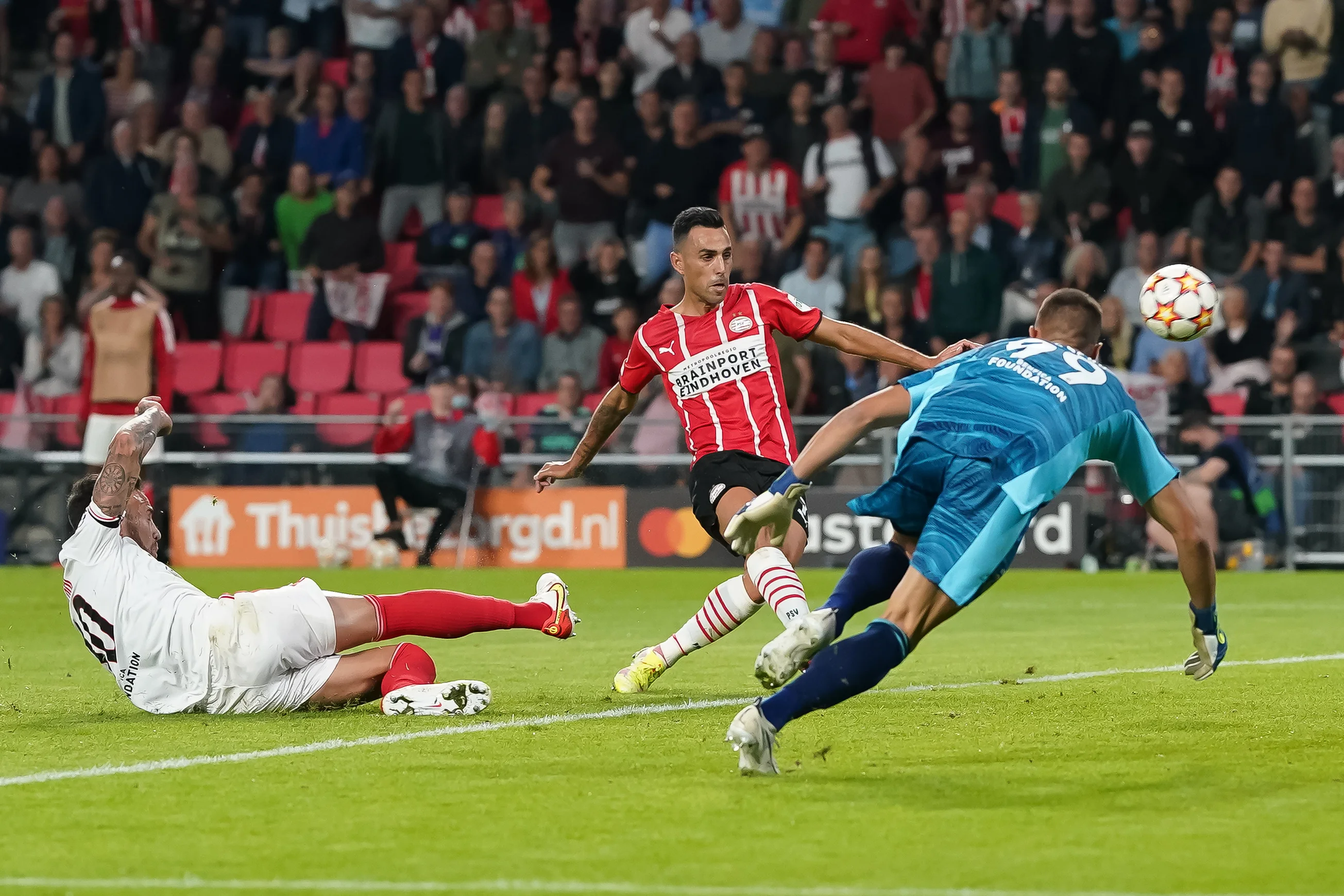 В завершальній частині зустрічі ПСВ навалився на португальців всіма силами. Господарям необхідно було забити всього один гол – і вони створили достатньо нагод, аби зробити це, однак голкіпер "орлів" стояв насмерть. Зокрема, він врятував на 86-й хвилині, виконавши подвійний сейв після вривання Вертессена на правий край штрафного й ударів з близької дистанції, а на 88-й він же взяв постріл Захаві метрів з 20-ти по центру.