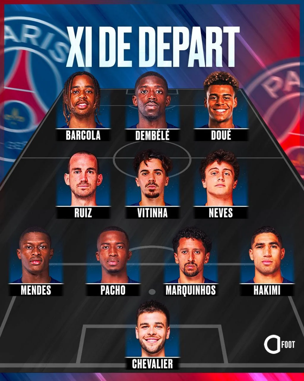 Стартовий склад ПСЖ: Шевальє – Хакімі, Маркіньйос (к), Пачо, Мендеш – Фабіан Руїс, Вітінья, Невеш – Дуе, Дембеле, Барколя.