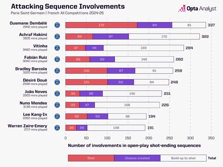 Показово, що у складі є одразу чотири футболісти, які були залучені до 5+ голів у Лізі чемпіонів 2024/25 – це Дембеле (10, Хакімі (7), Барколя (7) і Дуе (5). Даний факт багато говорить про різноманітність векторів і варіантів атак. Ще більше про неї свідчить статистика участі в комбінаціях з ударним завершенням.