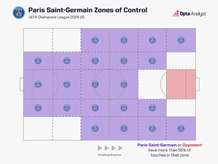 Арне Слот називав ПСЖ найбільш досконалим суперником. Париж залишається таким практично для всіх. Колектив демонструє догматичний футбол, працюючи від володіння, але Луїс Енріке відточив стиль ледь не до ідеалу. Його підопічні майже у всіх зонах на полі мають мінімум 55% контролю.