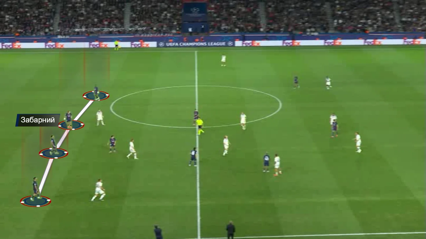 Саме на 75-й хвилині Ілля дебютував за ПСЖ у Лізі чемпіонів. Українець замінив Нуну Мендеша. Номінально Забарний розташувався на незвичній позиції лівого центрбека, але у фазі розвитку атаки в задній лінії формувалась трійка – тоді наш земляк розташовувався по центру.
