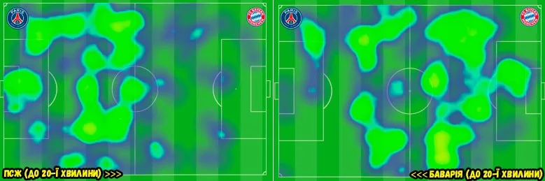 Мюнхен знову видав інфернальний старт, затоптавши французів інтенсивним пресингом. Володіння м'ячем на окремих відрізках сягало 56% на користь гостей. На тепловій карті помітно, що ПСЖ рідко виходив на чужу половину до 20-х хвилин, тоді як Баварія звідти не вилазила.