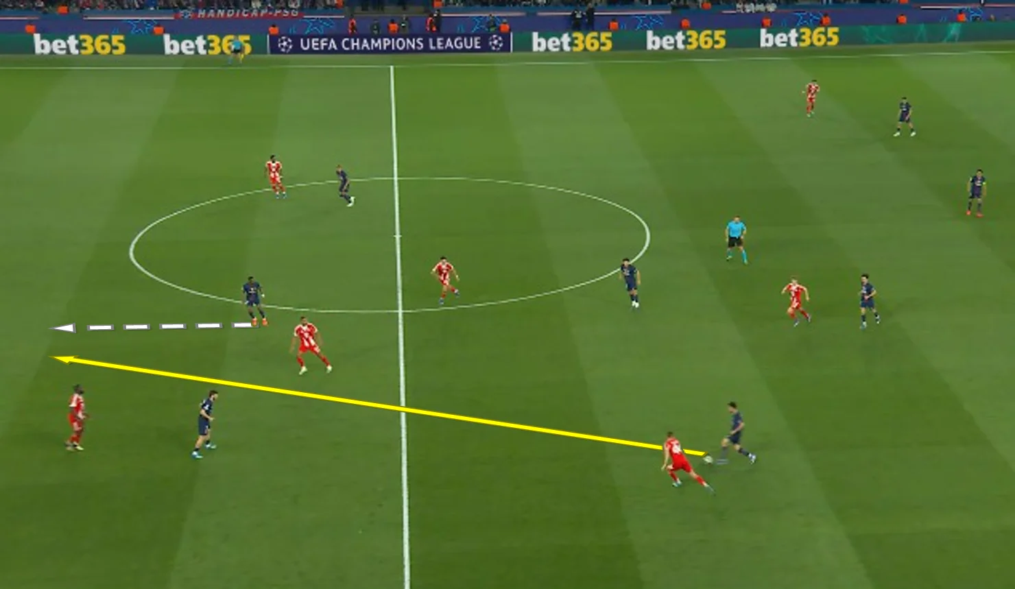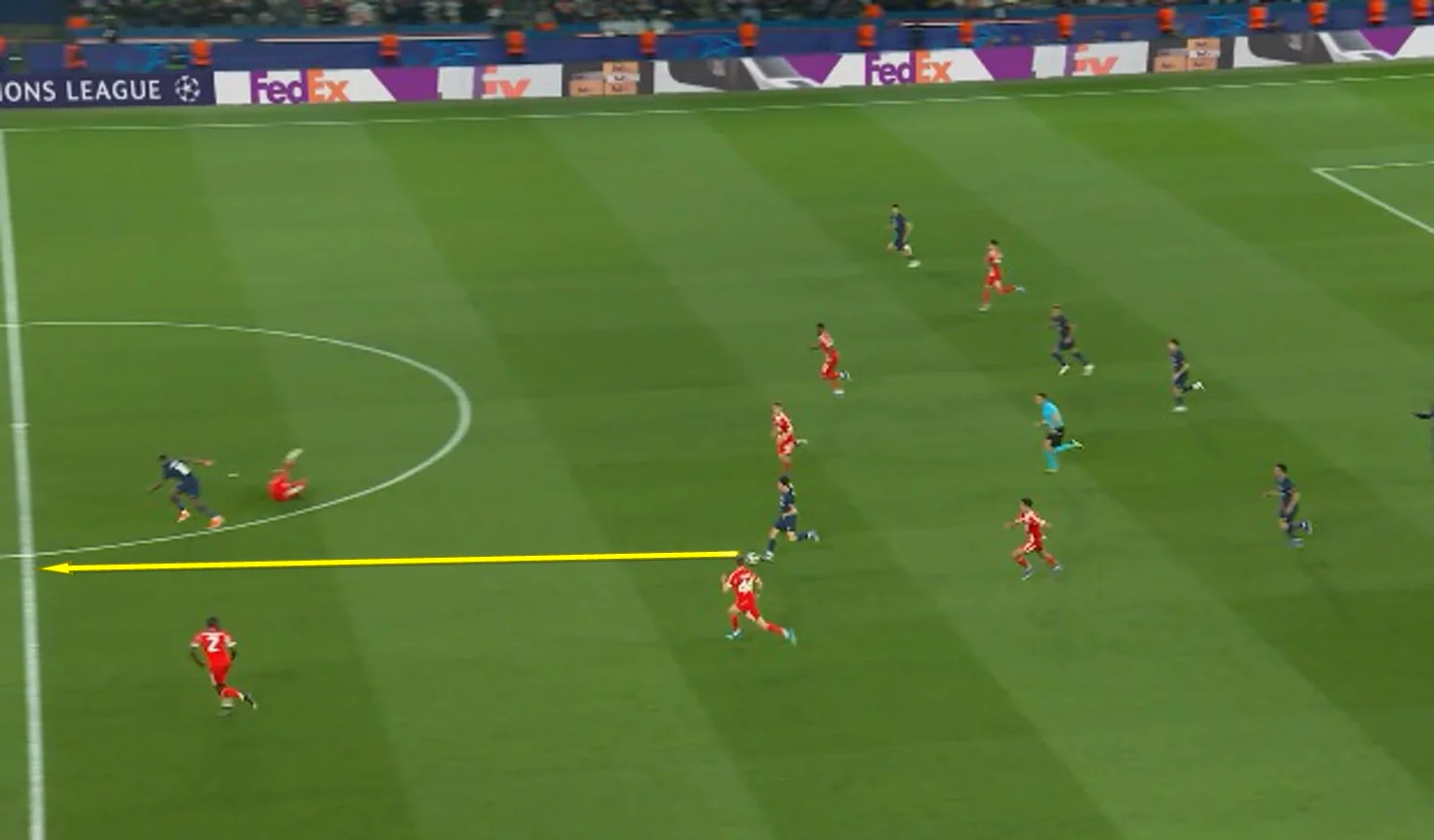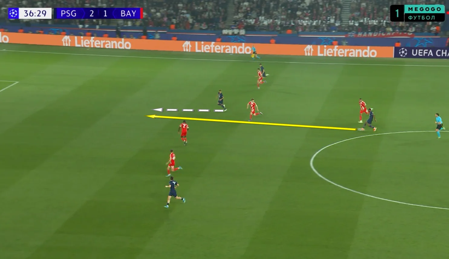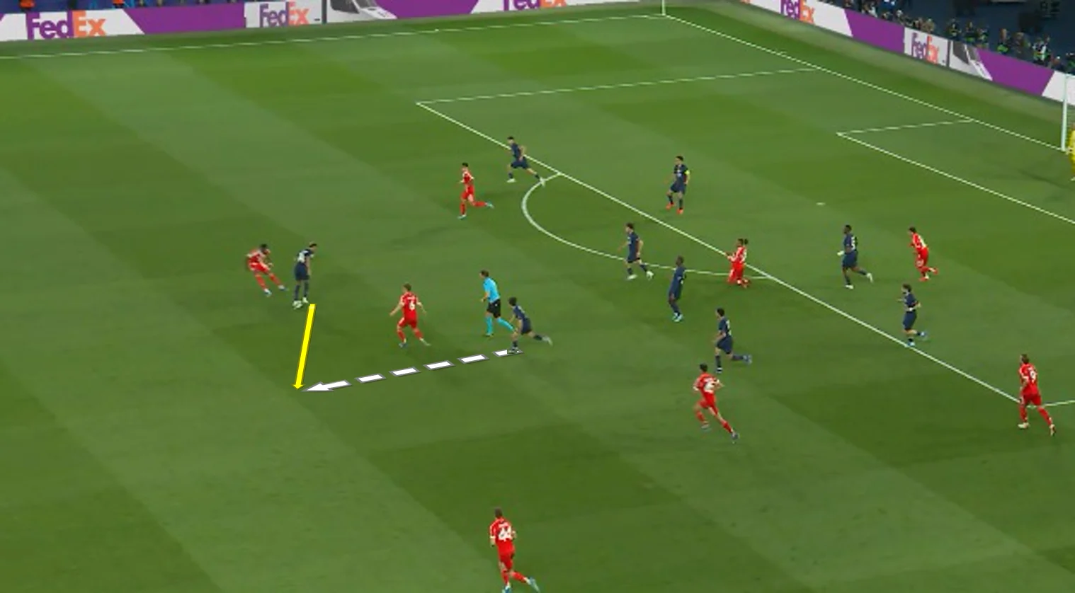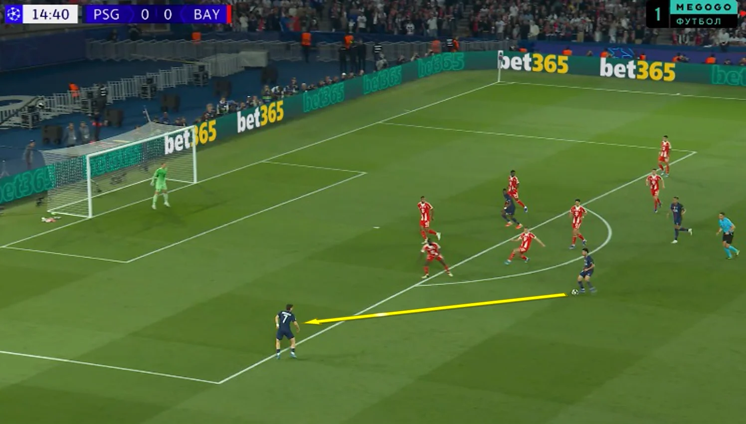 Частково територіальна перевага Баварії пов'язана і з планом Луїса Енріке. Парижани оборонялись компактним блоком, намагаючись витягнути суперника повище й порвати на контратаках – прямо як Реал у чвертьфіналі. Особливо вразливо виглядав правий фланг оборони німців, адже Станішіч у позиційних атаках та при пресингу часто зміщувався у центр, залишаючи простір позаду.