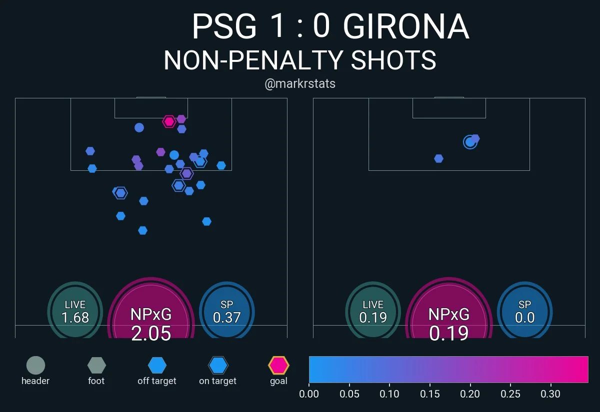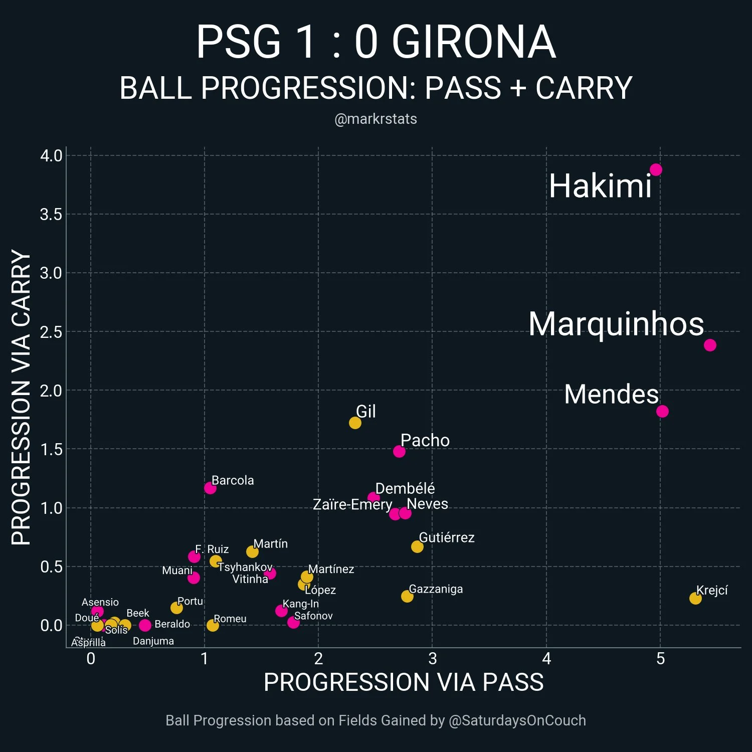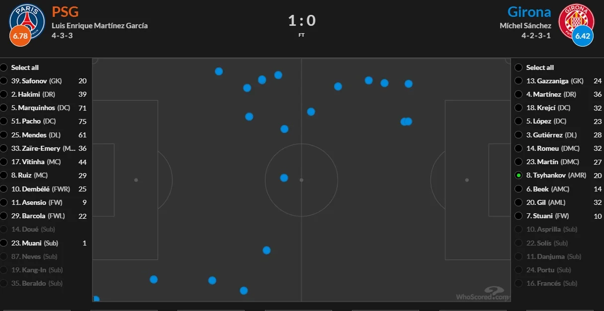 Із позитиву можна відзначити непогані просування під високим пресингом ПСЖ та відносно якісну роботу в середньому блоці. Настільки якісну , наскільки Жирона могла собі дозволити в такому матчі.
