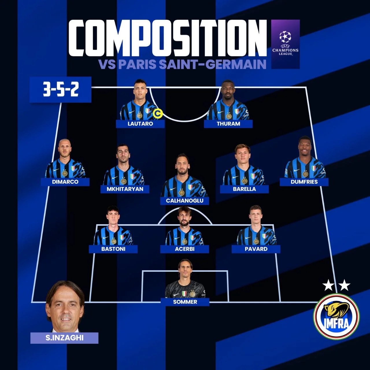 Інтер: Зоммер – Павар, Ачербі, Бастоні – Дюмфріс, Барелла, Чалханоглу, Мхітарян, Дімарко – Лаутаро, Тюрам