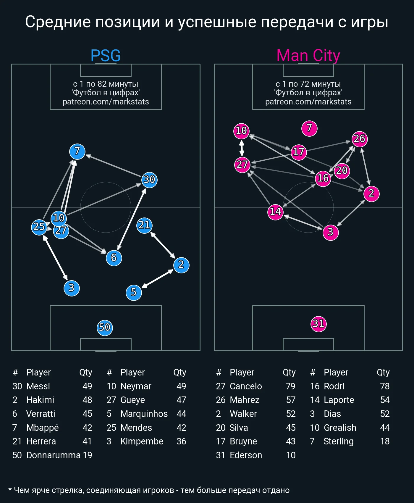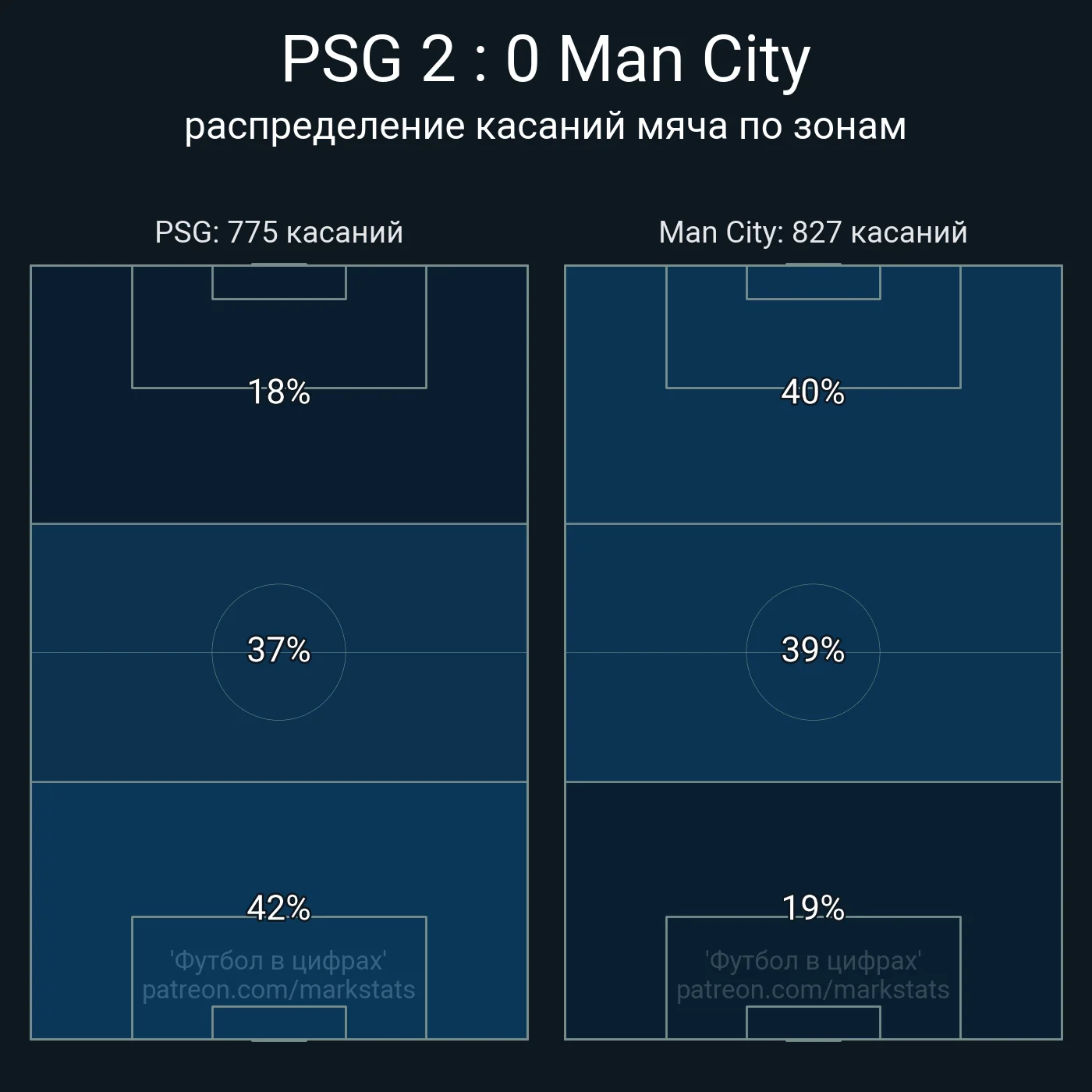 Особливо круто колектив виглядав у пресингу. На власній половині та в середині поля "містяни" повертали м'яч вже після сьомої передачі суперника, а перед чужим штрафним – після шостої. Домінування англійців у перших двох третинах поля можна списати на відсутність спротиву з боку ПСЖ, однак біля власних воріт парижани не були зацікавлені у свободі дій суперника. Тим не менш, вони подовгу не могли вийти з оборони.