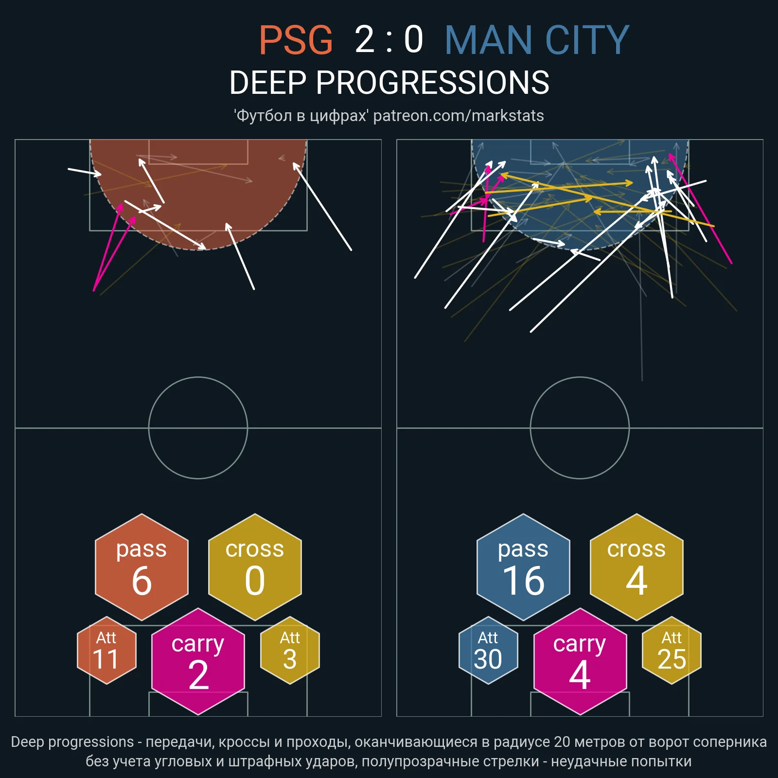 Манчестер Сіті 40% ігрового часу провисів на третині поля господарів, провів 20 передач у штрафний із сумарною гостротою 1,67 xT (у 2,5 разів вищий показник, ніж у суперника), завдав 12 ударів з меж штрафного, виграв більшість нічийних м'ячів, виграв боротьбу (55:43 за переможними дуелями), насичував зони підбирань і стріляв з метру в порожні ворота. Це мав бути розгром, але додому англійці поїхали без голів. Чому так?