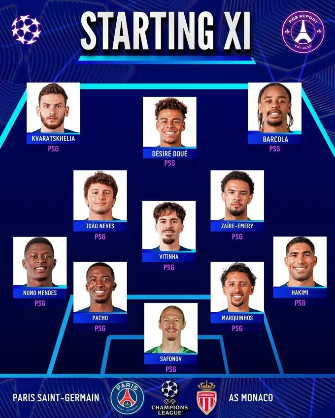 Стартовий склад ПСЖ: Сафонов – Хакімі, Маркіньйос, Пачо, Нуну Мендеш – Заїр-Емері, Вітінья, Жоау Невеш – Кварацхелія, Дуе, Барколя.