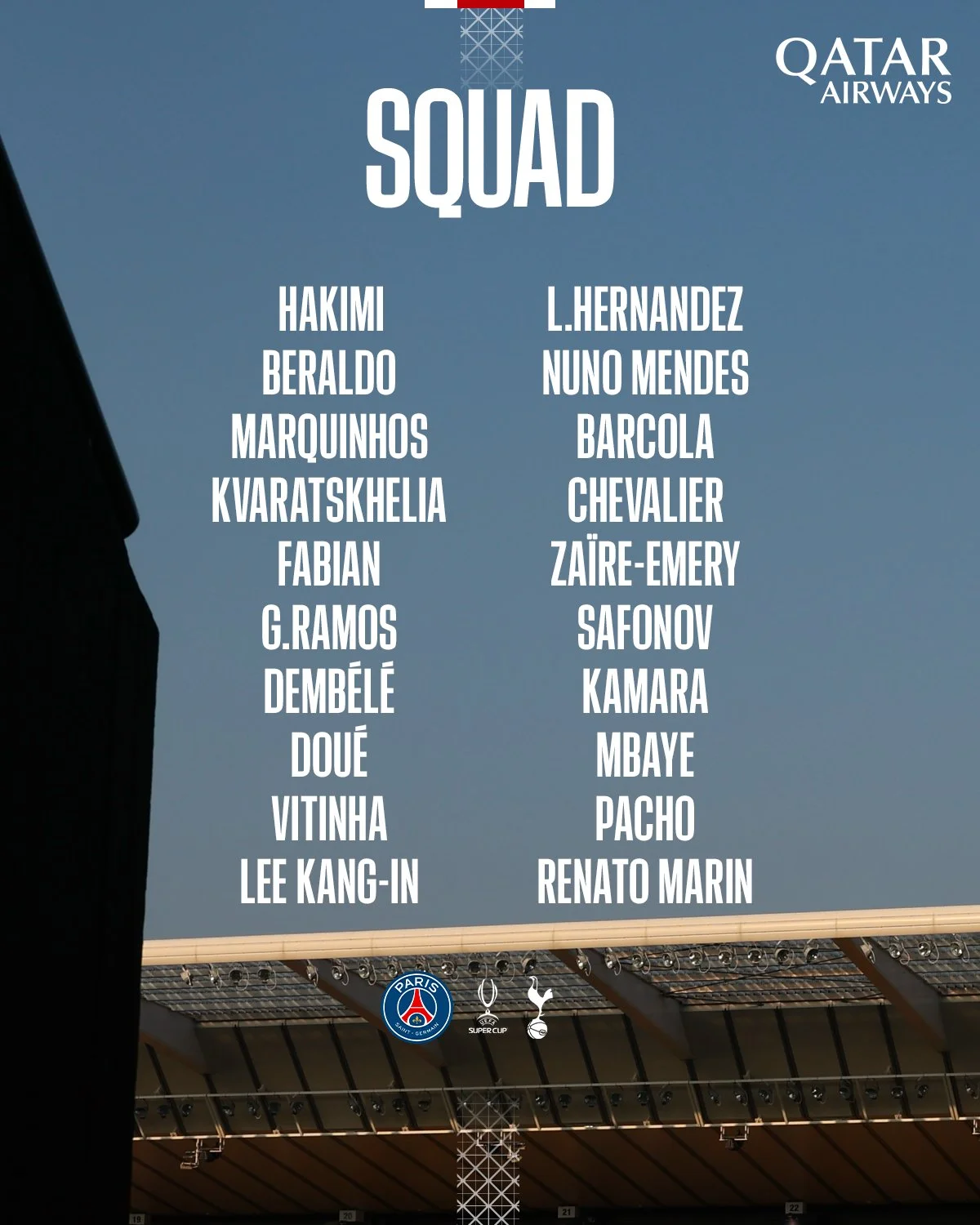 Паризький клуб оголосив склад команди на поєдинок за Суперкубок УЄФА проти Тоттенхема.