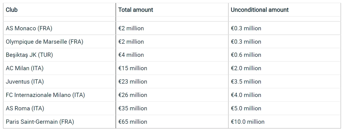Зокрема, свою провину визнали Бешикташ, Марсель, Монако, Інтер, Мілан, Рома, Ювентус та ПСЖ, повідомляє офіційний сайт УЄФА. Загальна сума штрафу становить 172 мільйони євро. Однак гарантовано клуби заплатять лише 15%. Решта 85% залежить від виконання умов добровільних угод. Термін виконання зобов'язань становить 3 роки або 4 роки.