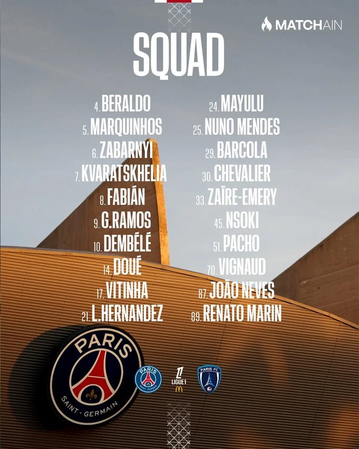 Прес-служба ПСЖ опублікувала заявку на поєдинок, до якої традиційно потрапив українець Ілля Забарний. Що стосується росіянина Матвія Сафонова, то попри повернення до тренувань, очікувано він ще не потрапив до заявки, адже досі носить бандаж після перелому руки. Натомість у складі ПСЖ на матч зазначено двох інших голкіперів – Люку Шевальє та Ренату Мартіна.