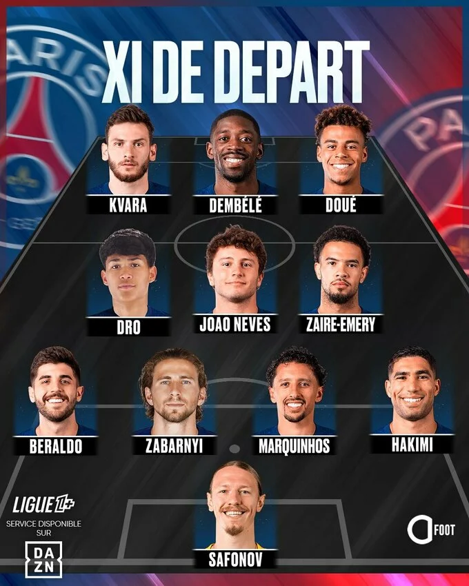 ПСЖ: Сафонов, Беральдо, Забарний, Маркіньйос, Хакімі, Дро Фернандес, Жоау Невеш, Заїр-Емері, Кварацхелія, Дембеле, Дуе.