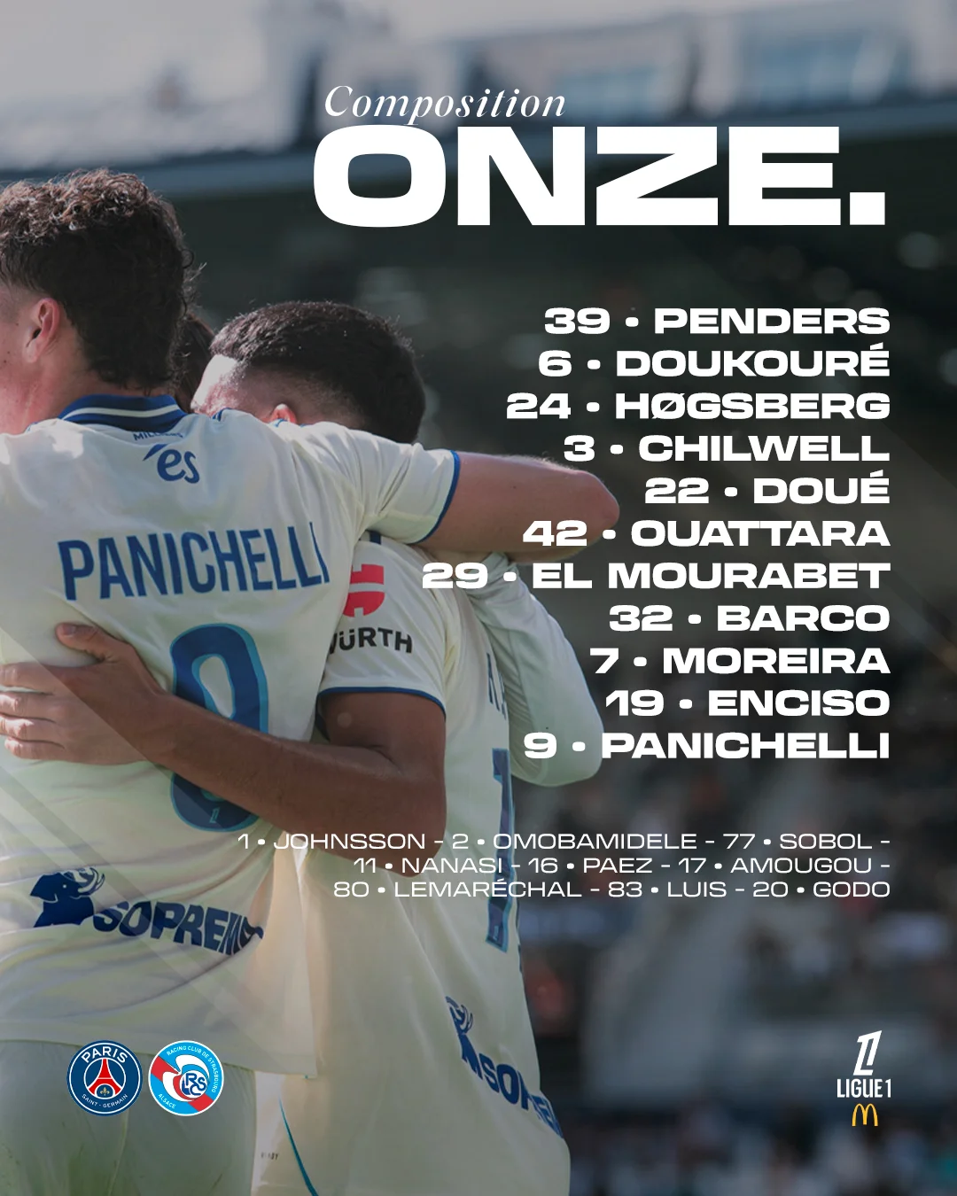 Стартовий склад Страсбура: Пендерс, Дукуре, Геґсберґ, Дуе, Енсісо, Морейра, Чілвелл, Ель-Мурабет, Барко, Уаттара, Панічеллі.