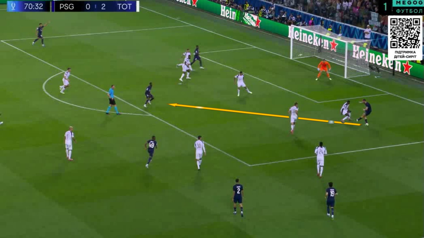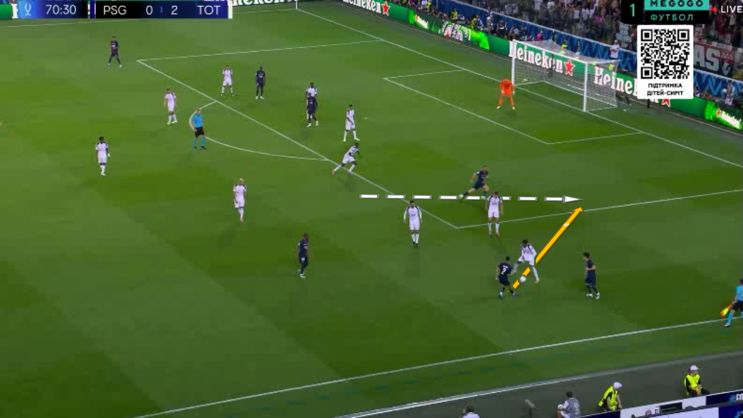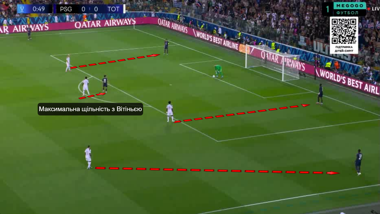 Томас Франк обрав таку ж модель. Тоттенхем чинив дуже агресивний пресинг, вбиваючи позиційні атаки ПСЖ у зародку. Особливу увагу приділяли щільній грі з Вітіньєю – саме він є ключовим футболістом у питаннях виводу парижан з-під тиску.