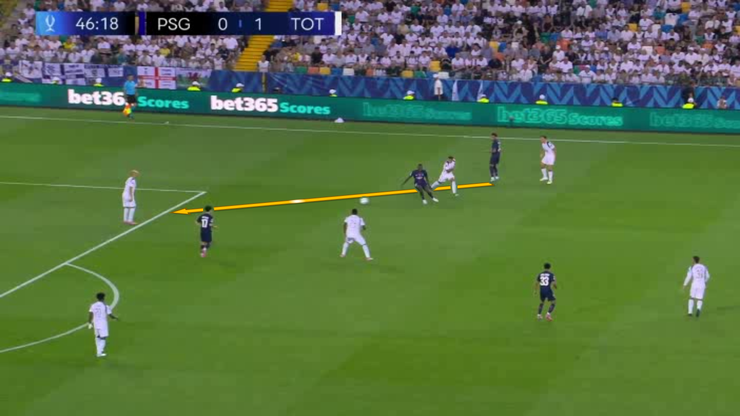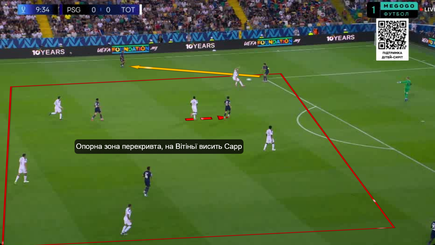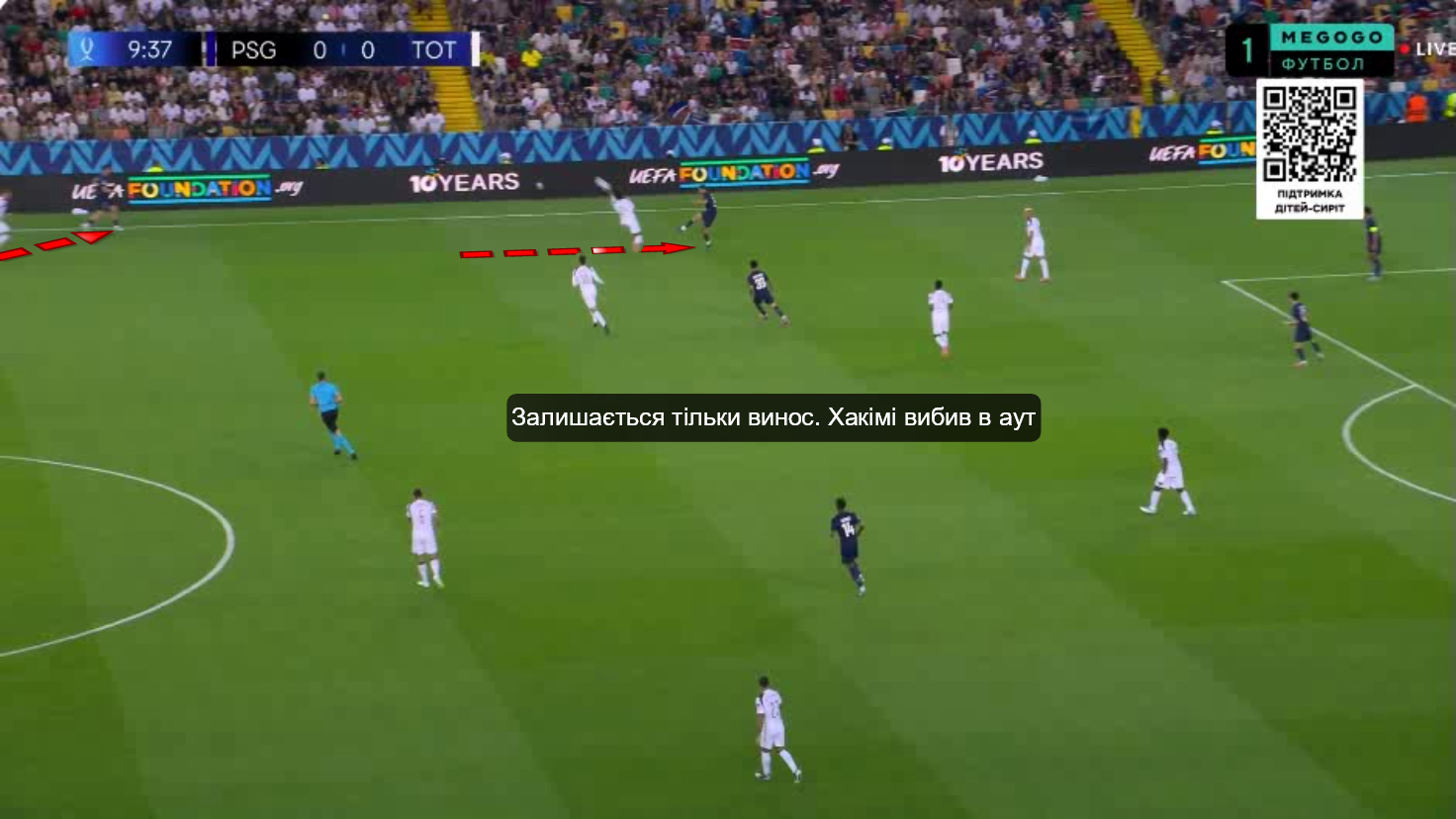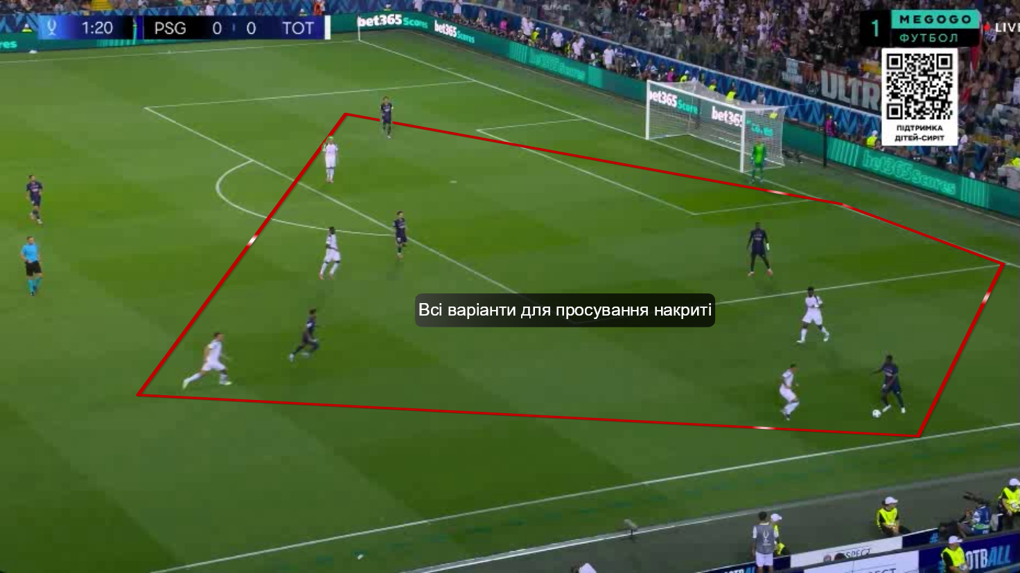 Томас Франк обрав таку ж модель. Тоттенхем чинив дуже агресивний пресинг, вбиваючи позиційні атаки ПСЖ у зародку. Особливу увагу приділяли щільній грі з Вітіньєю – саме він є ключовим футболістом у питаннях виводу парижан з-під тиску.