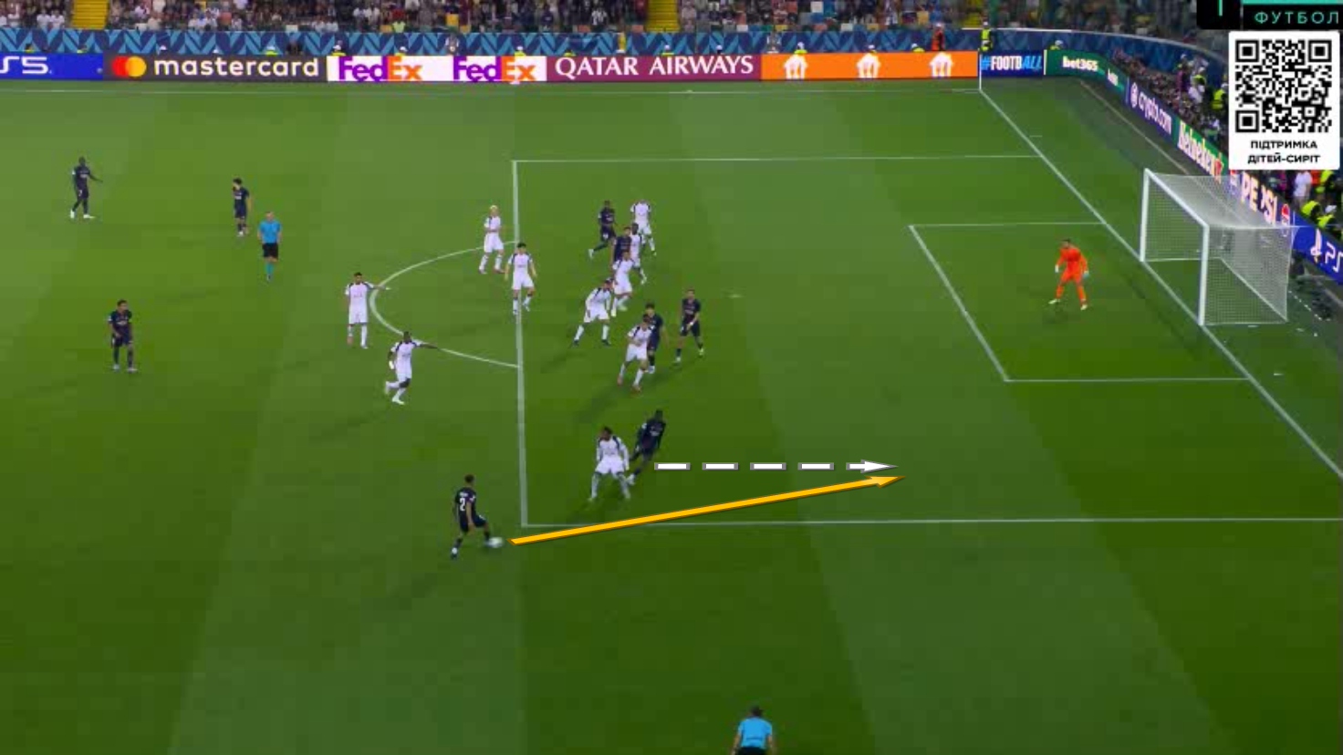 Переможці ЛЧ при подоланні пресингу пробували вмикати традиційні позиційні ротації, намагаючись плутати тріумфаторів ЛЄ. Дембеле опускався аж до позиції опорника, Дуе опинявся під нападниками, Мендеш грав на одній лінії з ними у напівфланзі – і так далі. Також підопічні Луїса Енріке намагалися розтягувати оборону суперника й зламувати її через фланги.