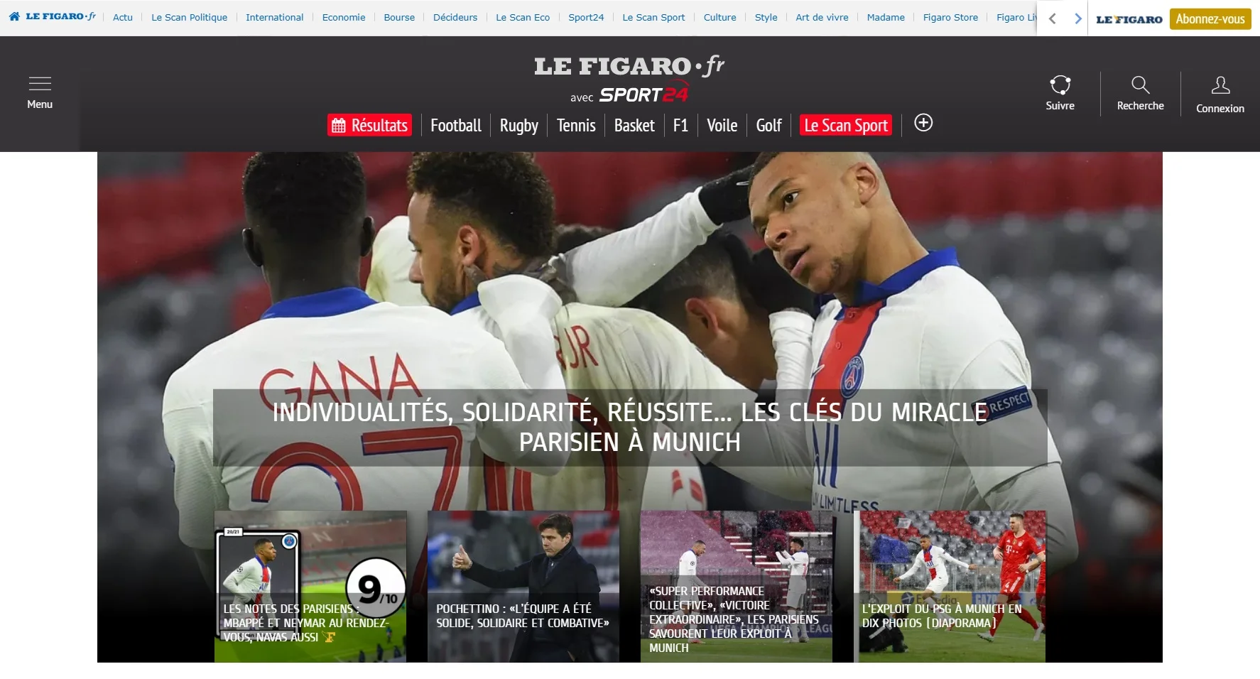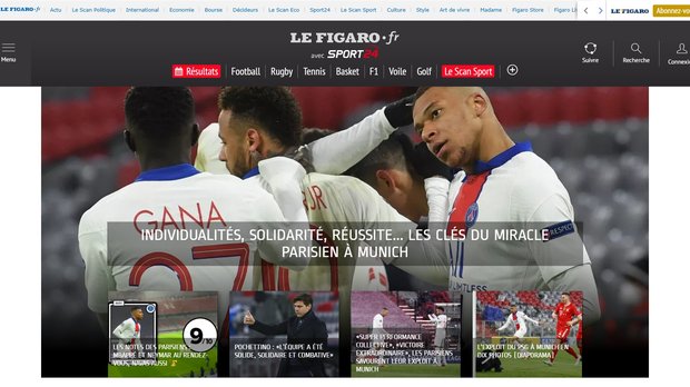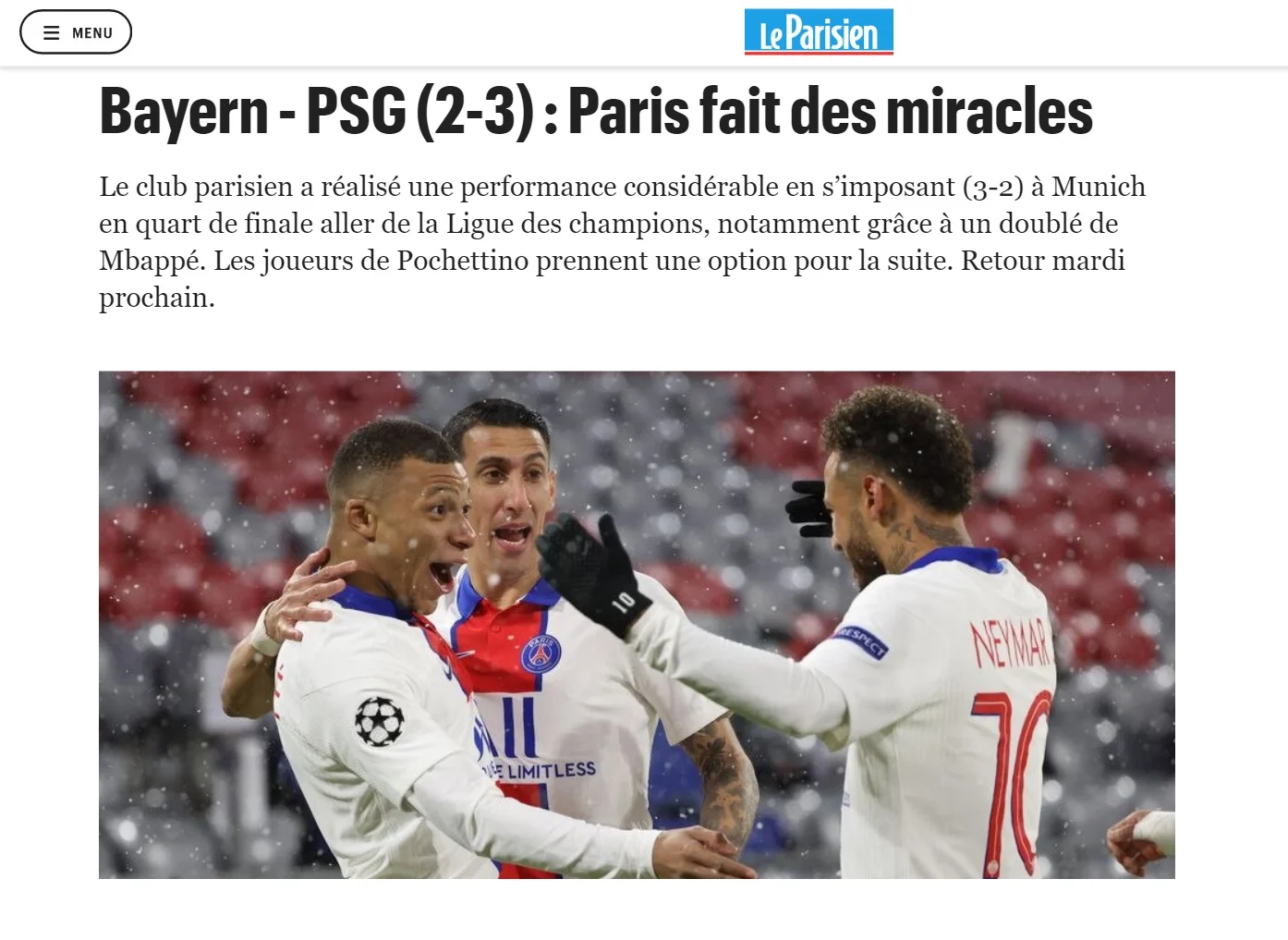 "У драматичному матчі ПСЖ страждав, іноді гнувся. Але його реалізм і характер дозволили привезти дорогоцінний успіх із Мюнхена. Якщо години перед такою зустріччю дозволяли мріяти про найдивовижніші сценарії, то той із них, який насправді був написаний у середу ввечері в першому матчі чвертьфіналу Ліги чемпіонів проти Баварії, був на межі наукової фантастики. Проте, паризький клуб досяг неймовірних успіхів на Альянц Арені, що дає йому хорошу фору для матчу-відповіді на Парк де Пренс у наступний вівторок. Під снігом 31 удару Баварії виявилося недостатньо, щоб зломити Париж з його шістьма спробами".