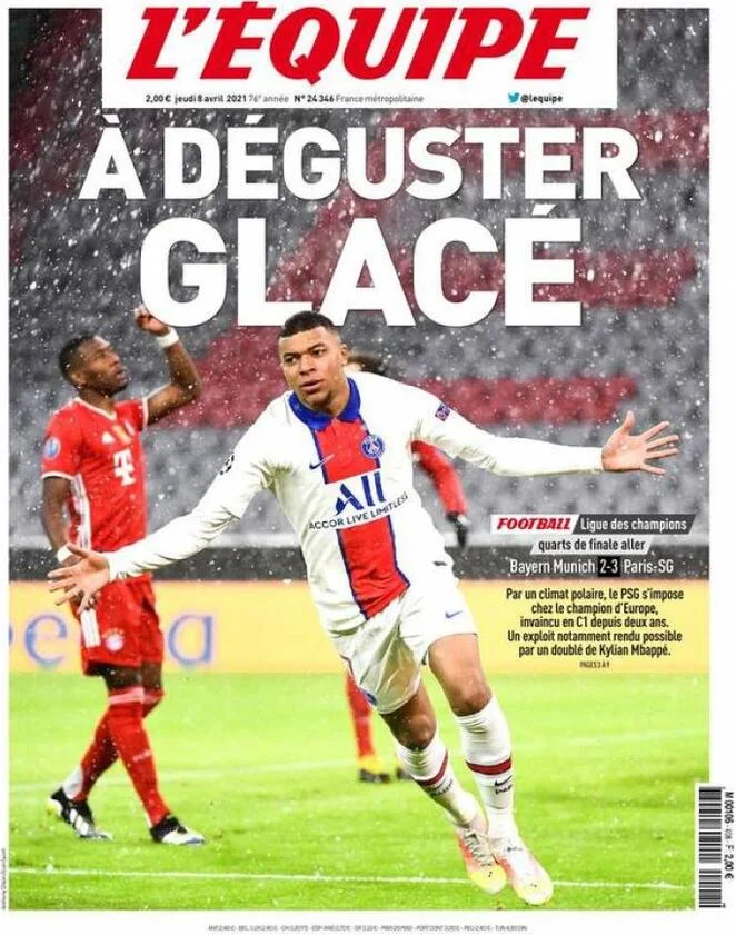 Провідне спортивне видання Франції розбирає невдачу своїх футболістів у багатьох матеріалах. Ліричний заголовок на передовиці друкованої версії наголошує на погодних умовах – в Мюнхені на початку квітня несподівано випав сніг. Зрештою, ПСЖ це не знітило, а L'Equipe бачить трьох героїв, без яких досягти такого результату не вдалося.