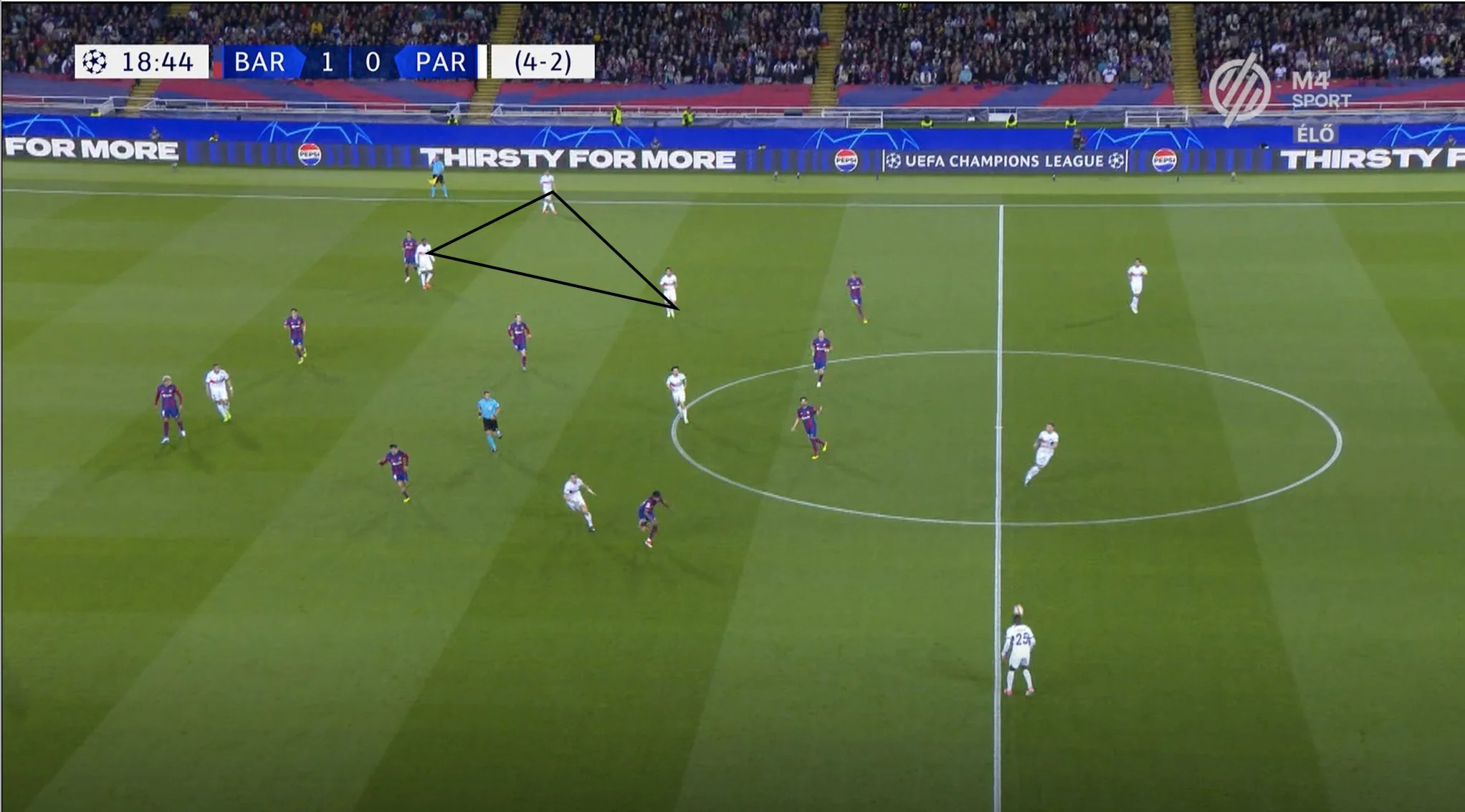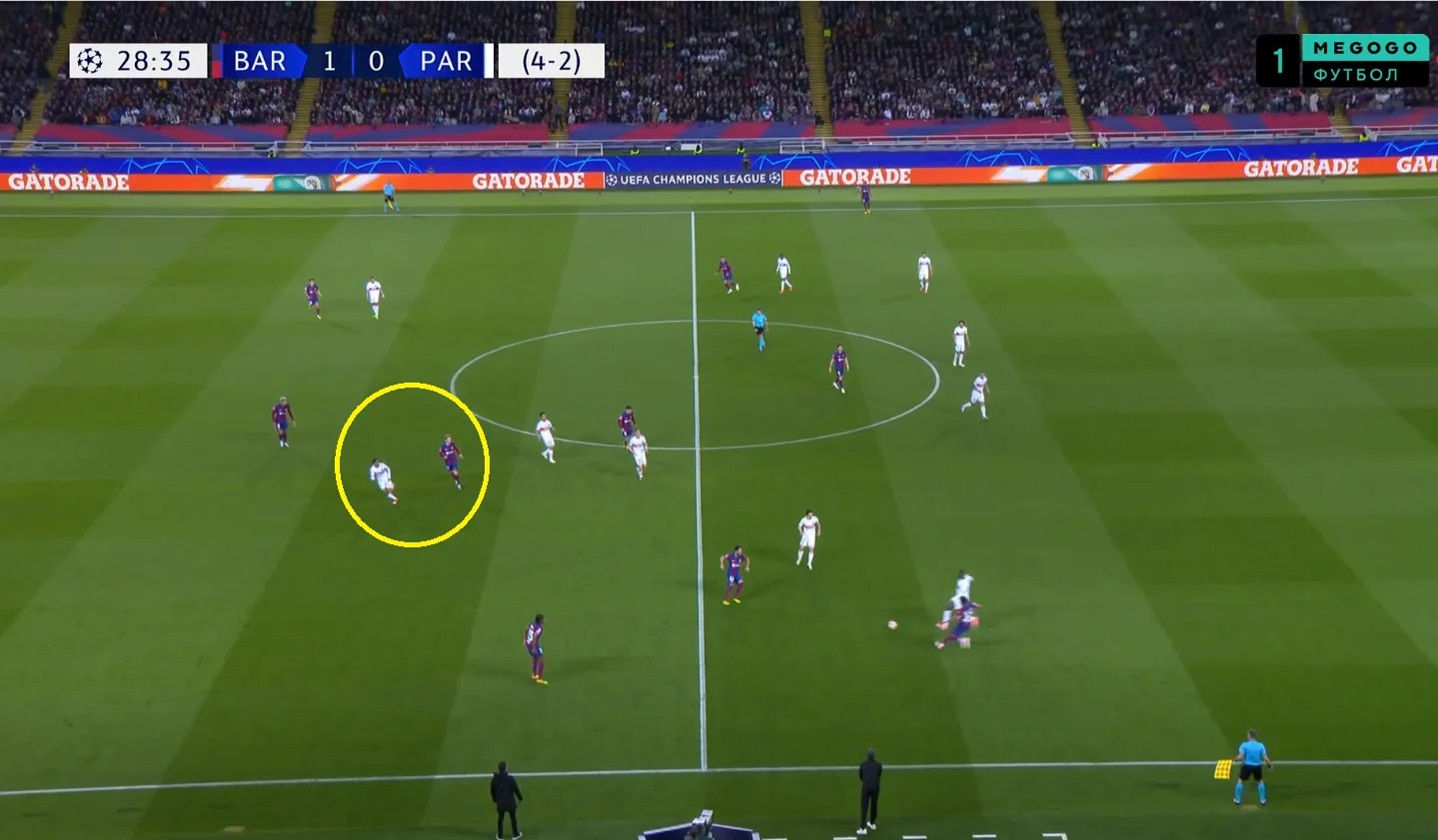 Крім того, застосовувались ротації у трикутнику між Ашрафом, Заїром-Емері та Дембеле. Це був дуже серйозний виклик для Френкі, Канселу й 17-річного Кубарсі. Паризька трійка заходила в центр, робила схрещення, забігання та загалом діяла злагоджено. Особливо в очі впадала інвертованість Хакімі, яка створювала 1-в-1 для Дембеле проти Канселу.