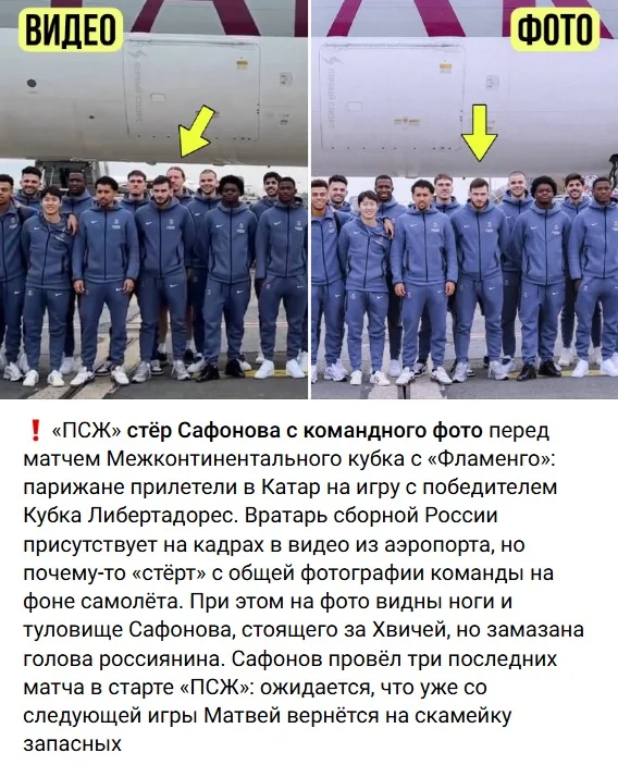 Перед вильотом ПСЖ зробив традиційне командне фото біля літака. Матвій Сафонов точно стояв за Хвічею Кварацхелією, але на світлині, яку опублікувала прес-служба клубу, залишились лише ноги росіянина, а обличчя стерли. Тим часом Ілля Забарний стоїть найближче до головного тренера Луїса Енріке й усміхається.