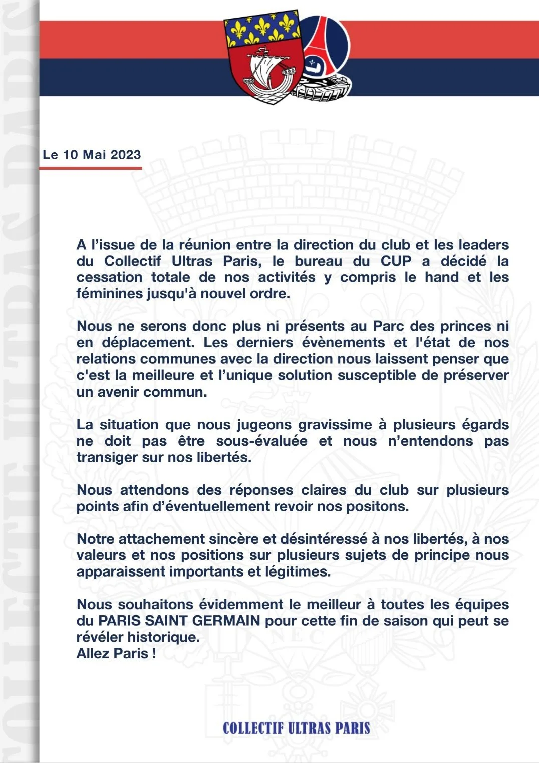 Collectif Ultras Paris (CUP) заявив у своєму прес-релізі, що втомився від неповажного ставлення з боку клубу. Ультрас оголосили, що припиняють усю діяльність до подальшого повідомлення, включаючи підтримку першої, а також жіночої та гандбольної команд. Це означає, що їхні місця на трибуні Отей можуть потрапити у вільний продаж або ж залишаться пустими. Фанати чекають реакції від керівництва клубу, але навряд чи до кінця сезону розбіжності будуть вирішені.