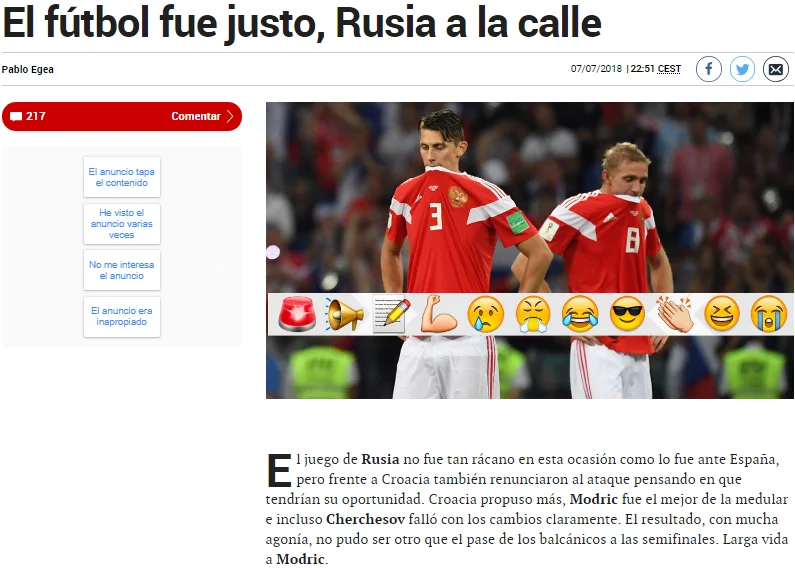 "Цього разу гра Росії не була такою жалюгідною, як проти Іспанії, однак з хорватами команда Черчесова також відмовилась від атаки, чекаючи на свій шанс. Хорватія запропонувала значно більше, а тому результат не міг бути іншим, ніж вихід балканців у півфінал. Хоча й з великою агонією", – зазначає Marca.