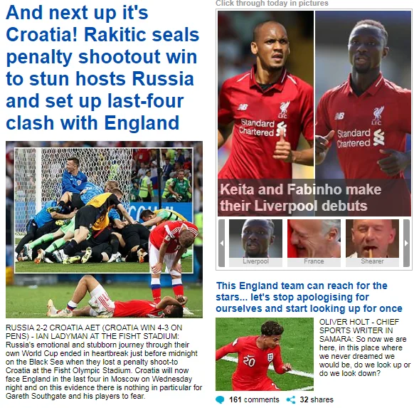 "Іван Ракітіч реалізував пенальті і після трилеру в Сочі Хорватія виходить в 1/2 фіналу, де зустрінеться з Англією", – пише Daily Mail.