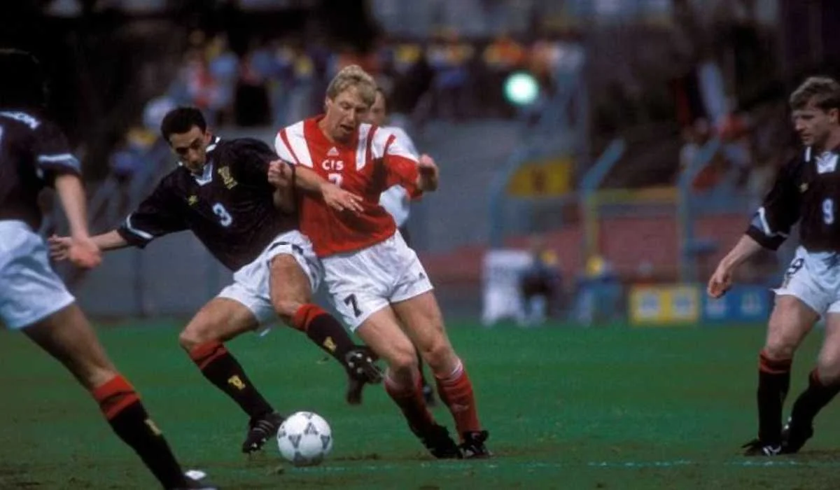 А ось Олексій Михайличенко залишився вірним Україні. На фото він в матчі, який став ленедарним. В останньому поєдинку групового турніру шотландці, котрі вже втратили шанси на вихід до півфіналу, взяли - та й розбили збірну СНД з рахунком 3:0. Хтось навіть запустив байку про те, що шотландці вийшли на поле... п'яними. "Не вірте, все це вигадки! Ми програли через недооцінку суперника і невезіння. М'ячі у наші ворота влітали після божевільних рикошетів", - розповідав опісля Михайличенко.