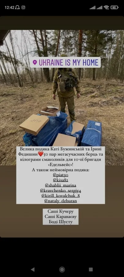 Бригада Едельвейс, до якої потрапив і Олег Ящук, отримала 50 пар берців, а також декілька кілограмів різних смаколик, про що повідомив журналіст у своєму Instagram.