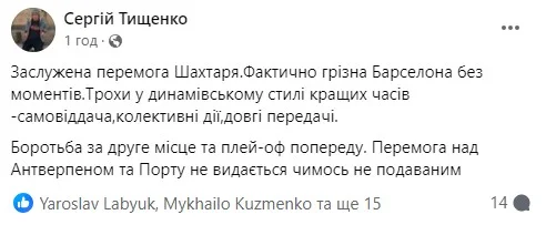 Експерти діляться враженнями від матчу 4-го туру ЛЧ Шахтар – Барселона (1:0).
