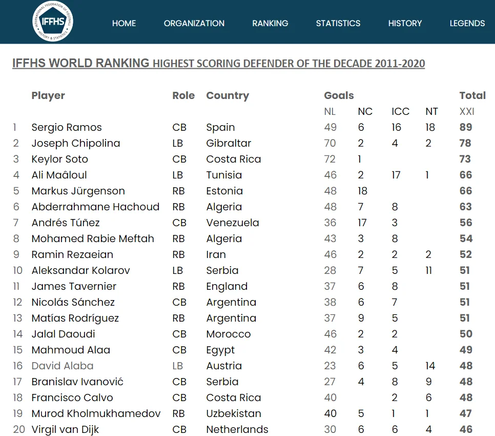 Міжнародна федерація футбольної історії і статистики опублікувала рейтинг найрезультативніших оборонців у світі за останнє десятиліття.