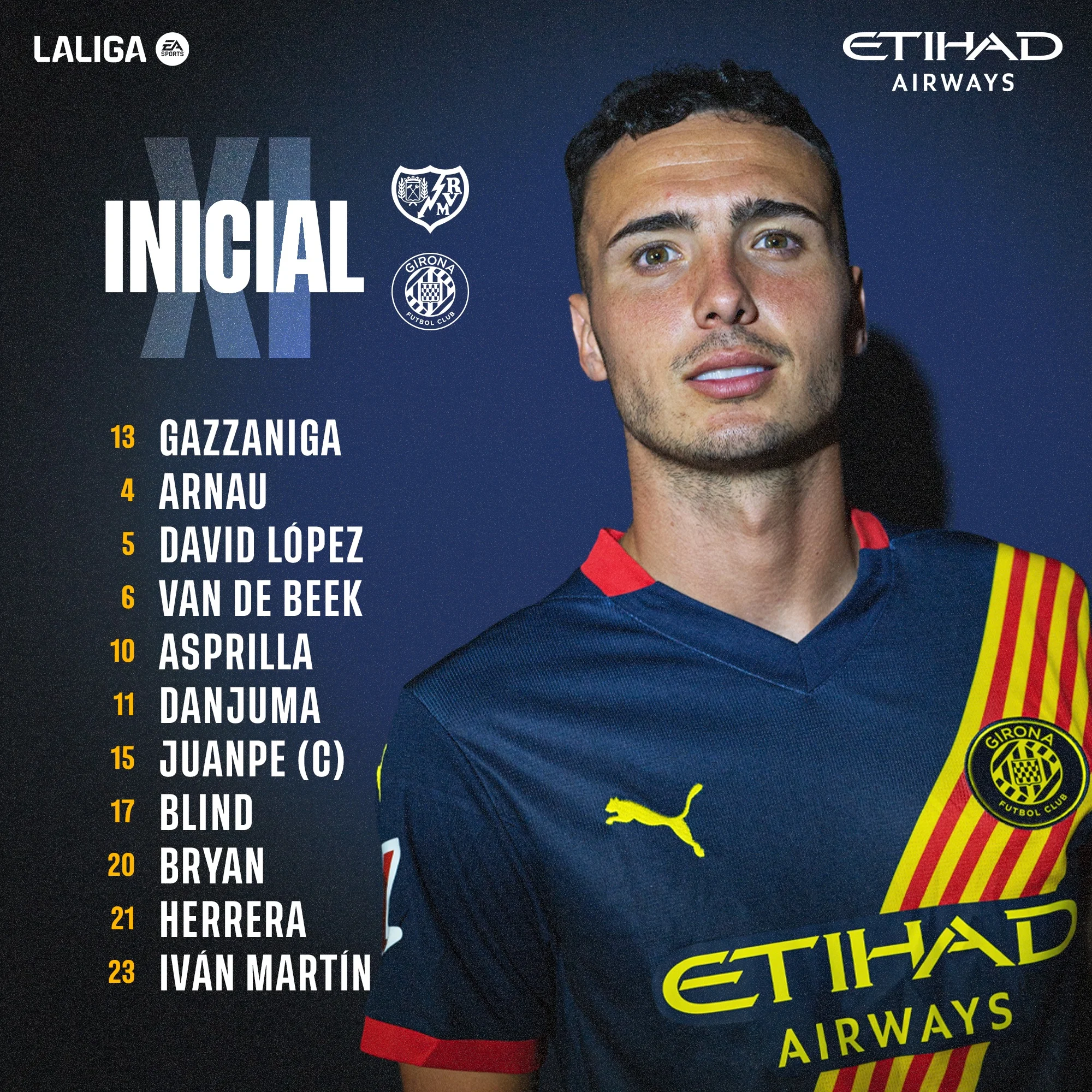 Стартовий склад Жирони: Гассаніга – Арнау Мартінес, Давід Лопес, Блінд, Хуанпе – Аспрілья, ван де Беек, Груневелд, Іван Мартін, Еррера – Хіль
