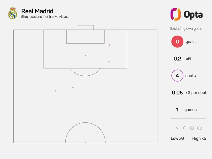 Перший тайм неприємно вразив фанатів "королівського клубу". Гості провели всього чотири удари по воротах, награвши на мізерні 0,22 очікуваних голи. Це другий найгірший показник гостроти Реала у стартові 45 хвилин у поточному сезоні (гірше було тільки з Барсою). Якщо ж без цифр, то пригадується лишень постріл Вальверде з гострого кута та щільний удар Родріго по центру – без проблем для голкіпера.