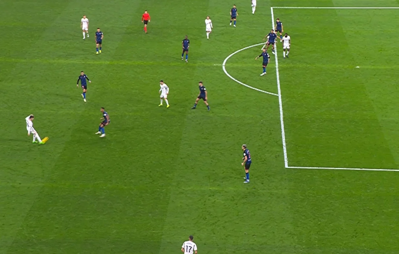 Реал у першому таймі теж не фонтанував моментами (4 удари), а активізувався вже в другому. Найближчим до гола був Вальверде: здалеку пальнув під поперечину, а потім опорною ногою пробив у стійку. На перспективні позиції виходив Вінісіус.