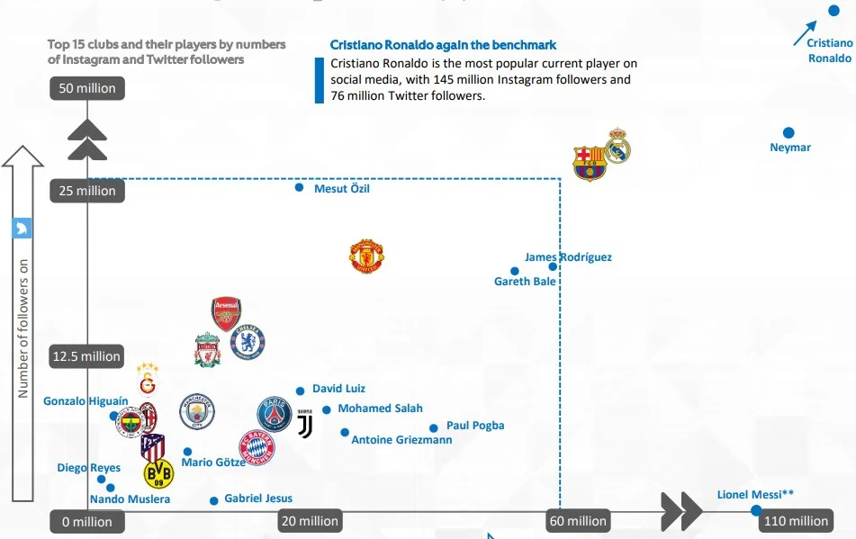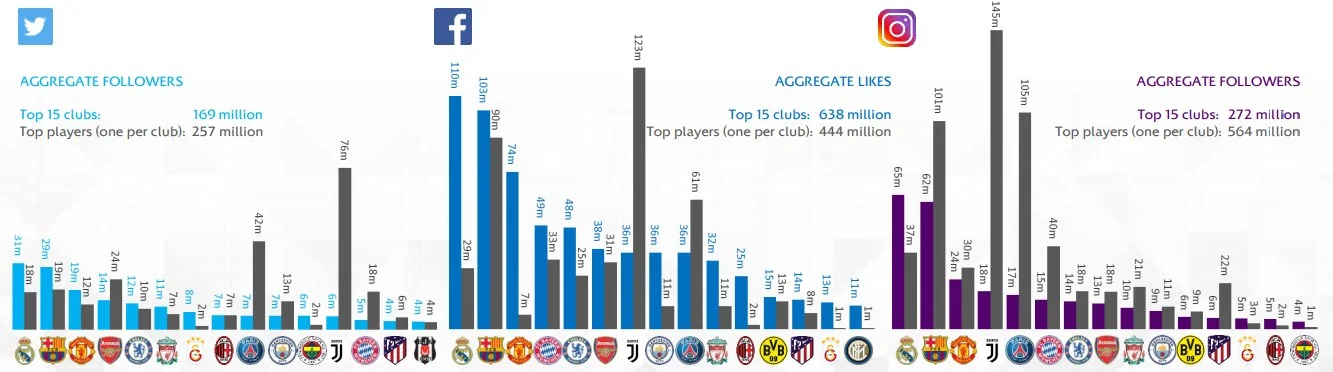 Характерна особливість полягає в тому, що гравці значно популярніші в Instagram. Якщо взяти топ-10 найпопулярніших клубів у цій соцмережі, то тільки Реал переважає свого найбільш зафолловленого гравця за підписниками. Ювентус (18 млн) і поряд не стоїть з Роналду (145 млн), Барселоні (62 млн) далеко до Мессі (101 млн), ПСЖ (17 млн) менше цікавить молодих юзерів, ніж Неймар (105 млн).