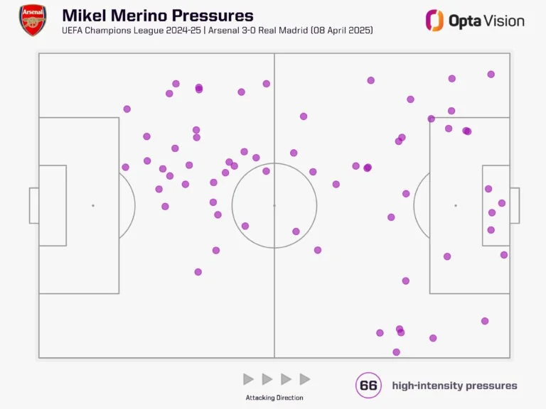 Контролюючи рух м'яча, Мікель Артета загнав "вершкових" у низький блок, в якому мадридці особливо вразливі. Спроби вийти з нього розбивались об інтенсивний тиск острів'ян – Арсенал провів 115 високих пресингів, а Мадрид припустився 24-х низьких втрат. Словом, поразка мадридців виявилась тотальною, хоча Карло Анчелотті з більшістю зірок списали невдачу на два ракетних удара Райса зі штрафних.