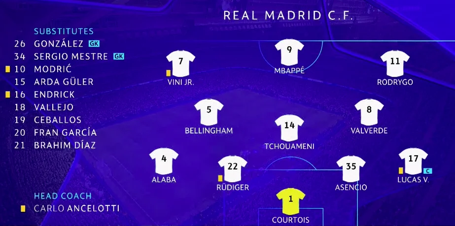 Карло Анчелотті, своєю чергою, провів дві перестановки – дискваліфікованого Камавінгу замістив Чуамені, а на правому фланзі оборони з'явився Васкес. Це був дуже ризикований хід, враховуючи проблеми Лукаса в захисті. Вальверде ж перейшов у центральну трійку.