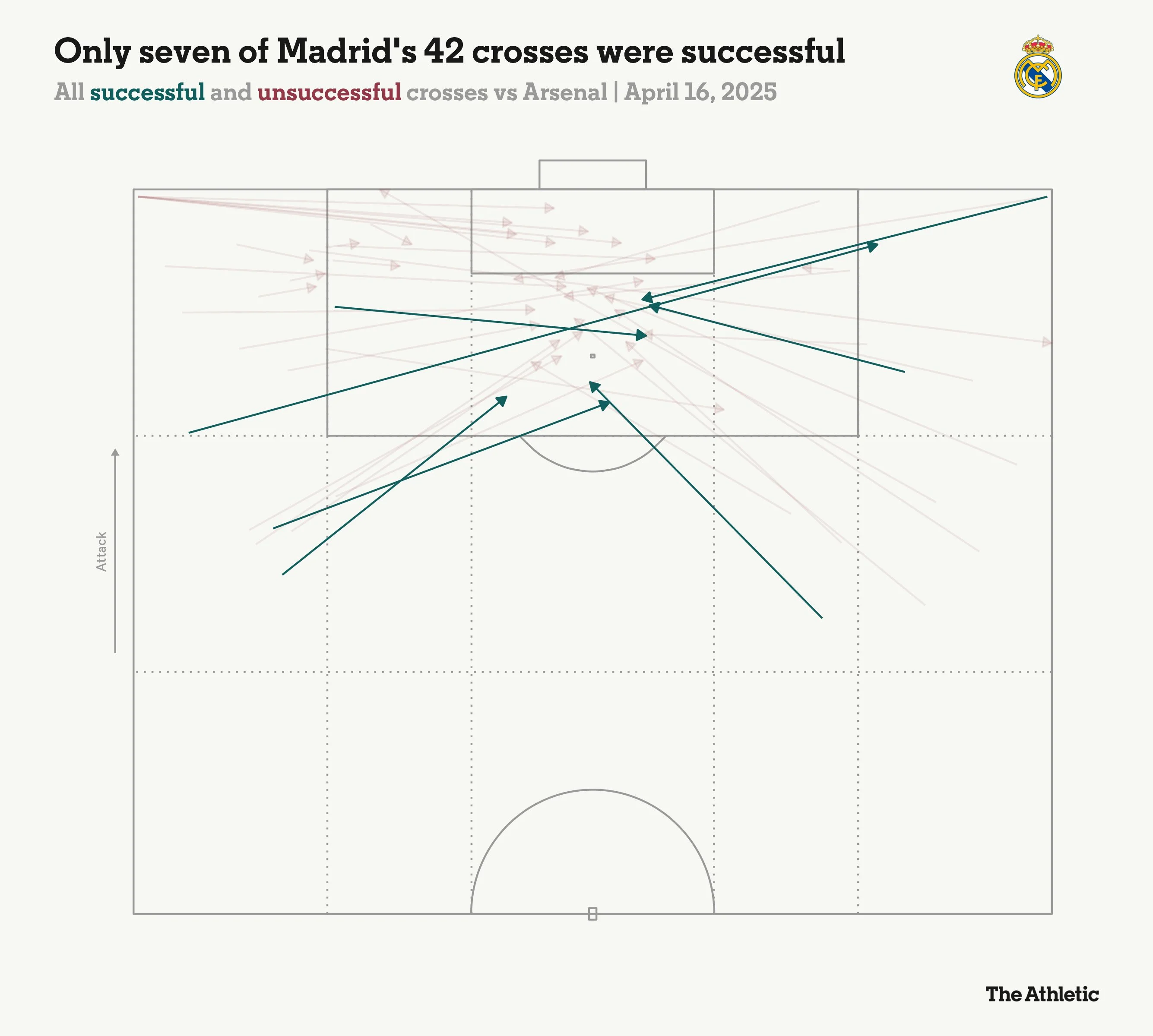 Вінісіусу, Родріго та Мбаппе у позиційних атаках бракувало простору, адже Арсенал сідав низько й почасти створював лінію з шістьма захисниками. При цьому спіймати гостей на перехідних фазах не вдавалося, хоча на Емірейтс у Реала було 4-5 потенційних і реальних виходів віч-на-віч.