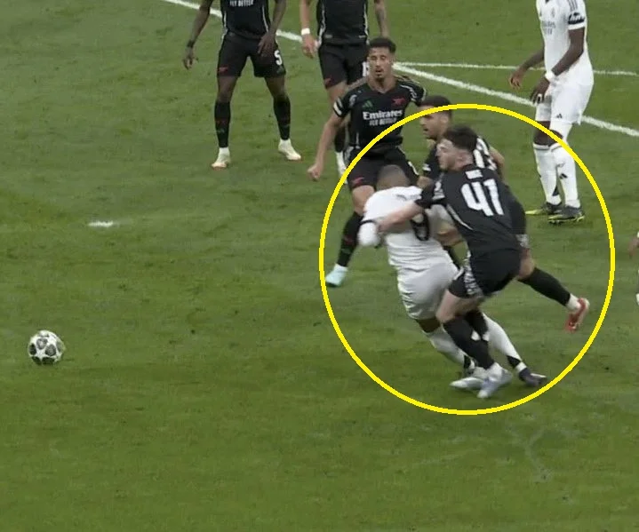 На 23-й же хвилині пенальті було призначено у ворота Арсенала! Ситуація була схожою – при стандарті пішла подача на дальню стійку, куди теоретично міг вриватись Мбаппе, однак Райс прихопив Кіліана обома руками. Француз одразу ж завалився на газон.