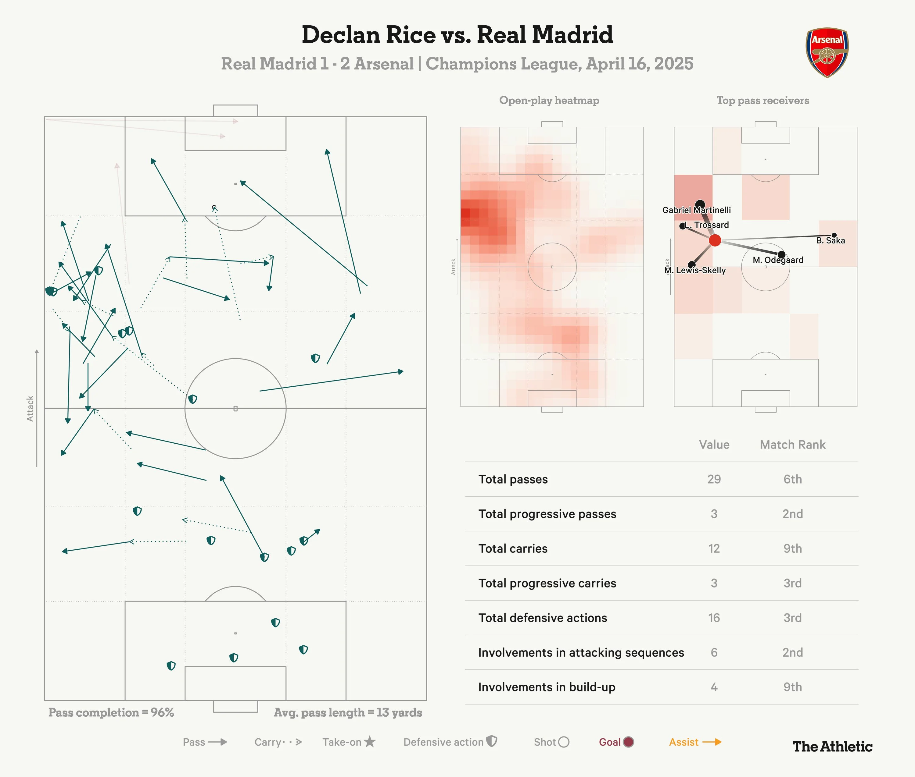 Арсенал спокійно відбивався, та ще й тікав у контратаки. Все частіше й частіше. У цій роботі слід відзначити Райса – він вже не забивав зі штрафних, але увійшов у топ-3 "канонірів" за кількістю ведень з просуванням і передач з просуванням. Як і за участю в атакувальних комбінаціях та дій в обороні.