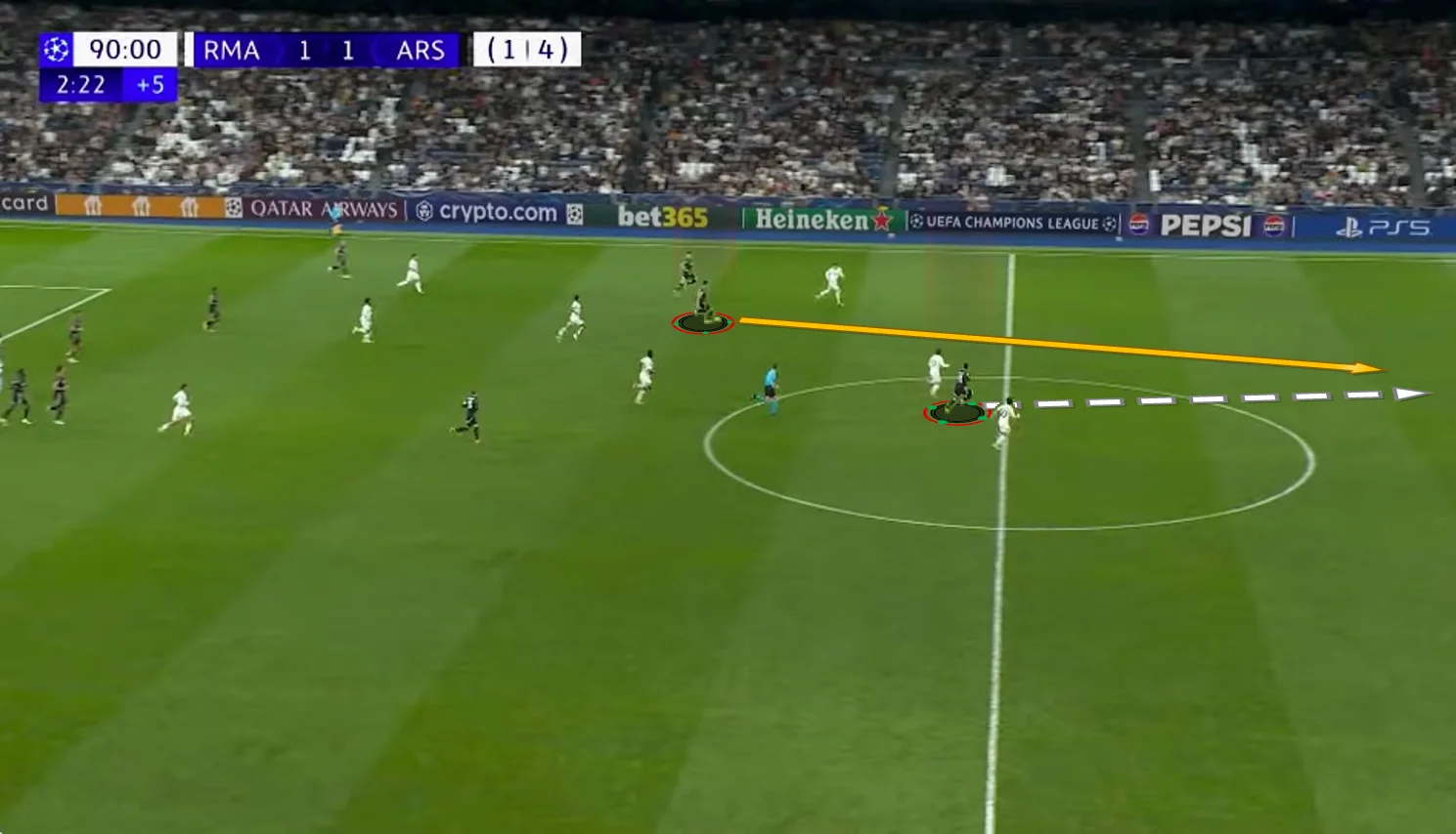 Підопічні Мікеля Артети підтверджували статус найкращої оборони Європи, хоча й не гребували затягуванням часу (голкіпер Рая навіть отримав за це попередження). Команда прогнозовано віддала ініціативу й падала в низький блок, однак на початку зустрічі північні лондонці навіть переважали Реал за володінням. Що найбільш важливо, вони створювали великі проблеми на лівому фланзі оборони Мадрида.