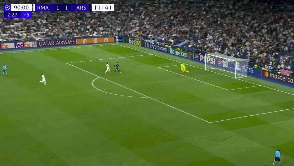 Здавалося, що інтрига в протистоянні буде знищена вже на початку матчу-відповіді. До м'яча підійшов Сака... І не забив! Букайо незграбно виконав "паненку", а Куртуа зробив сейв. Реал залишився у грі!