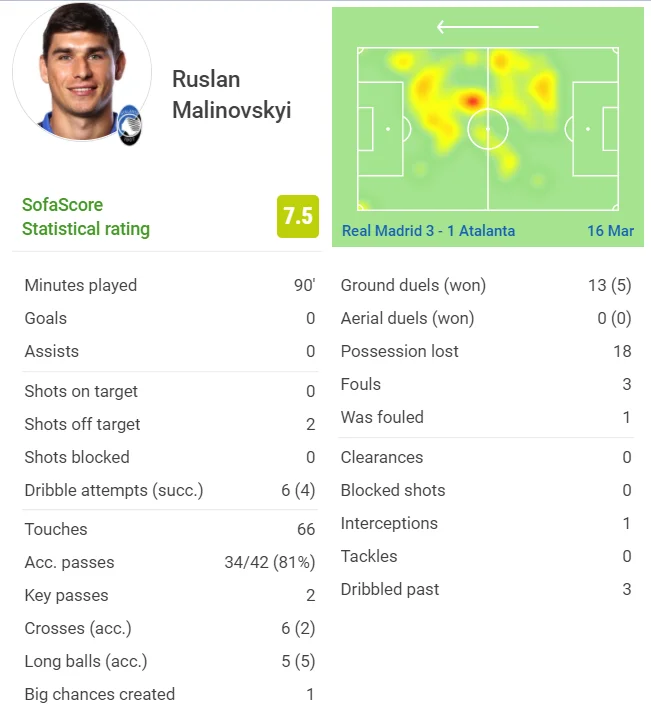 За всі ці старання статистичні портали визнали Руслана одним з найкращих футболістів Аталанти у матчі: Sofacore дала 7,5 балів (лідер), а Whoscored поставив 6,9 (другий після Мурієля, у якого гол). Крім того, у нього дуже об'ємна теплова картка та карта передач. В пропущеному ж другому голі винен не він.