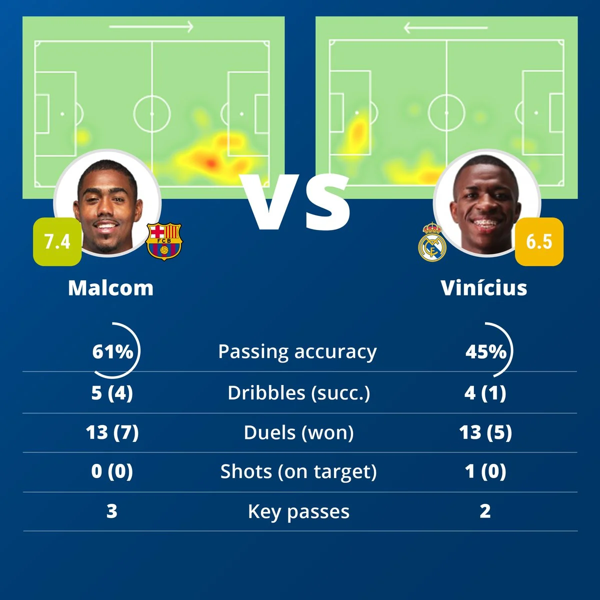 Кубкове Ель Класіко стало першим у кар'єрі бразильських новачків Барси і Реала – Малкома та Вінісіуса. Перший довго не міг адаптуватися у Каталонії, часто гальмуючи атаки й розчаровуючи фанів "блаугранас", але у поєдинку проти "королівського клубу" Малком став істинним героєм зустрічі. Він не просто замінив Мессі на правому краю атаки, а навіть затьмарив його – і справа тут не лише у голі.